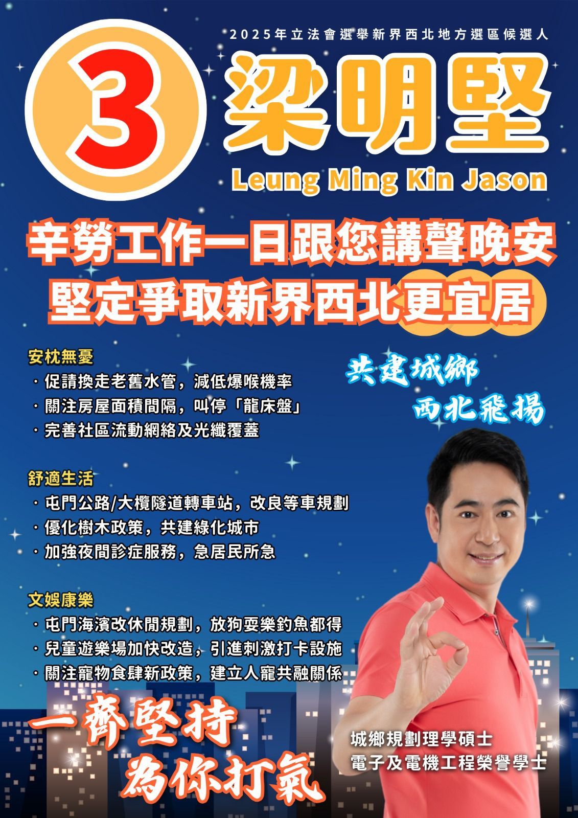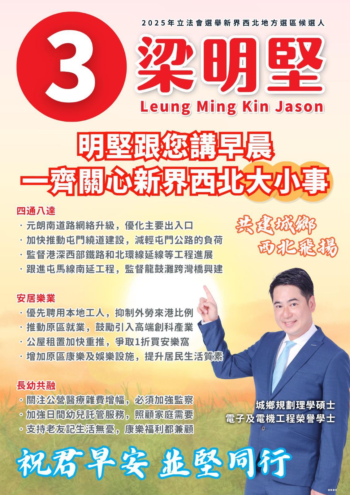 3號候選人梁明堅,現任元朗區議員,獨立無黨派。交通方面,梁明堅主張興建屯門繞道/11號幹線,監察進度,希望從此塞車不再;關注港鐵屯門南延綫工程,杜絕沙塵噪音影響居民生活;口岸關口交通接駁亦要加強,引入特別班巴士,來往皇崗/深圳灣/落馬洲更方便。至於經濟,梁明堅倡議關注屋邨商舖超市空置問題,引入不同零售店舖;推動居民原區就業,發展屯門海濱地攤經濟,關注寵物食肆落實進度,振興地區商機活力。青年發展方面,梁明堅關注生育率偏低,不影響退休保障前提下,研究容許新手父母一次性領取強積金,用作養育小朋友;鼓勵政府擴展「共創明Teen」扶助基層,關注學童情緒、補習資源,全方位推動青年上流。