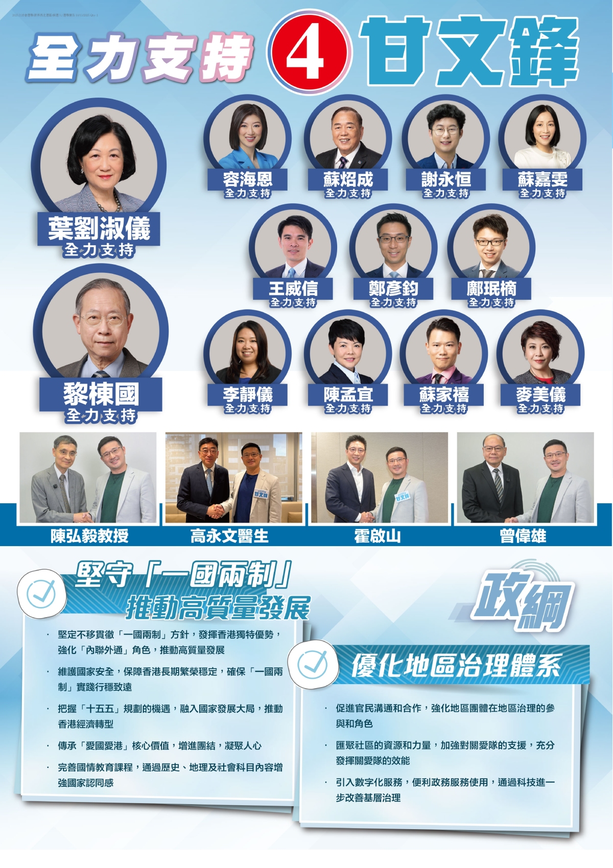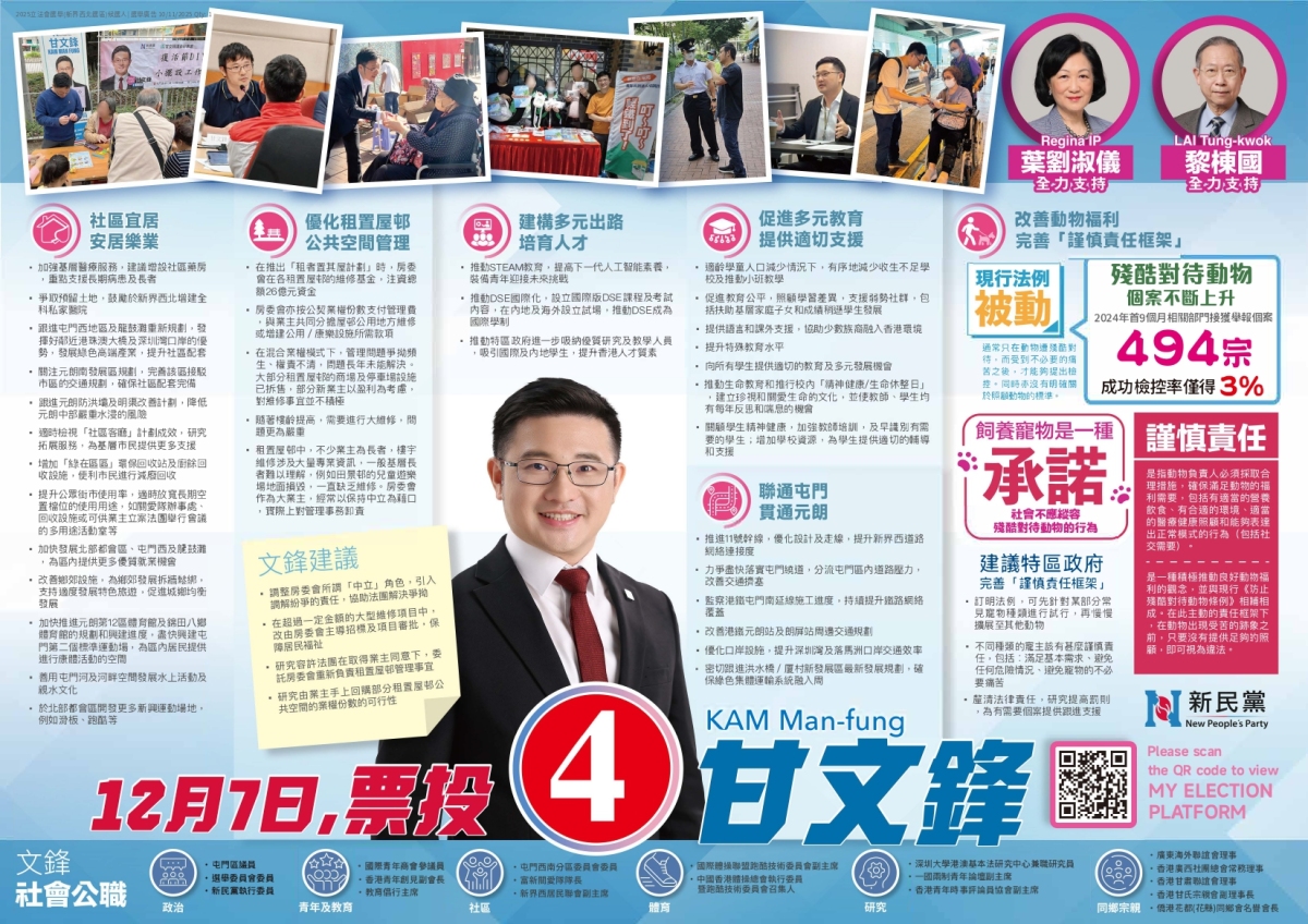 4號候選人甘文鋒,現任屯門區區議員,來自新民黨。交通方面,他繼續推進11號幹線,優化設計及走線,提升新界西道路網絡連接度;力爭盡快落實屯門繞道,分流屯門區內道路壓力,監察港鐵屯門南延綫施工進度,改善港鐵元朗站及朗屏站周邊交通規劃等。經濟方面,加快發展北部都會區;改善鄉郊設施,支持適度發展特色旅遊;跟進屯門西地區龍鼓灘規劃,發揮好當區鄰近港珠澳大橋及深圳灣口岸的優勢,發展綠色高端產業。青年方面,他倡議推動STEAM教育,提高青年人工智能素養;推動DSE國際化,設立國際版DSE課程及考試內容,推動DSE成為國際學制;推動政府吸納優質研究及教學人員,吸引海內外學生,提升香港人才質素。