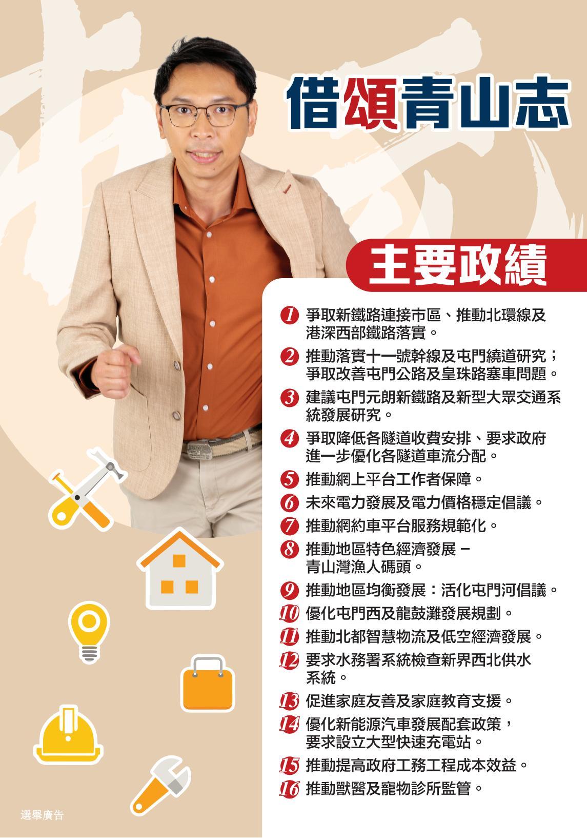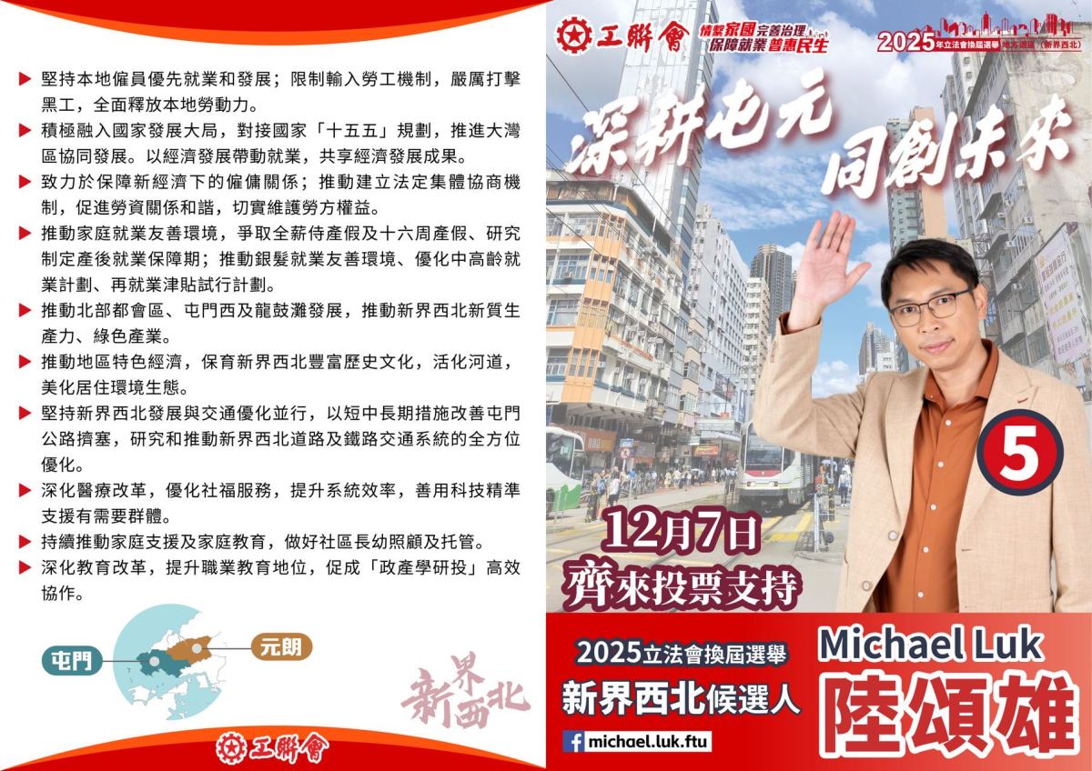 5號候選人陸頌雄,今屆代表工聯會,由選委會界別改戰新界西北。交通方面,他倡擴建屯門公路轉車站及大欖隧道轉車站;推動青朗公路增設北行交匯處及完善三隧分流;推動加快北環綫、港深西部鐵路及中鐵綫落成;研究興建新過海交通、新鐵路及龍鼓灘北岸通道的可行性。經濟方面,他主張優化人才政策,保障本地人才發展和就業優先;結合北部都會區和龍鼓灘新發展區,以「十五五」規劃為基礎,推動新質生產力發展,並發展循環經濟、低空經濟等;保育新界西北歷史文化,打造青山灣漁人碼頭,推動海岸海島經濟、特色運動經濟、市集經濟等。至於青年發展,他促「政產學研投」高效協作,加強青年生涯規劃教育;建議設立「青年未來置業儲蓄計劃」等。