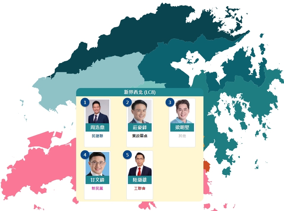 【點新聞報道】第八屆立法會選舉將於12月7日舉行,當中20個地區直選議席,有51位候選人競爭,選情激烈。其中新界西北選區包括屯門區及元朗區東南部,共有5名候選人,分別是1號周浩鼎、2號莊豪鋒、3號梁明堅、4號甘文鋒及5號陸頌雄,該區有超過43.6萬選民。點新聞繼續以交通、經濟及青年發展為重點,整理新界西北選區候選人的政綱理念,以方便選民選出賢能治港者。