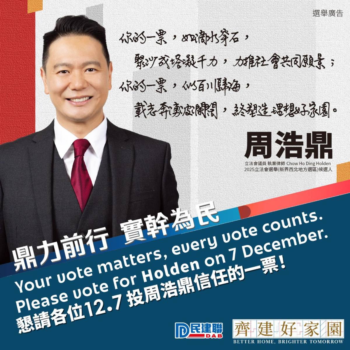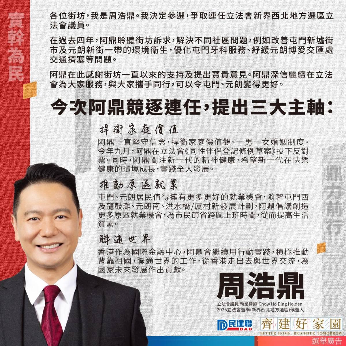 1號候選人為爭取連任的民建聯立法會議員周浩鼎。交通方面,他繼續力爭興建洪水橋站、屯門東站,及欣澳鐵路;爭取大欖隧道轉車站建設升降機或扶手電梯,重新規劃該處附近的交通安排,以應付附近八鄉及錦田新增人口的交通需要。經濟及青年發展方面,他指要有效結合金融及創科,鼓勵已進駐香港的先進產業企業,在香港上市及設立企業財資中心;推動屯門西綠色航運中心,引入綠氫加注服務及綠色燃料的研發機構,創造多元就業機會;促請政府檢討DSE乙類應用學習課程的評估分數(最高只能獲取四級),收窄和其他科目差距,避免相關學習被矮化;透過誘因爭取國際一流大學,於北都大學城和本地大學合辦分校,或合辦創新先進產業高管課程,吸引人才落戶香港。