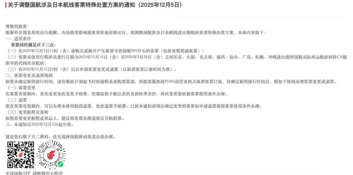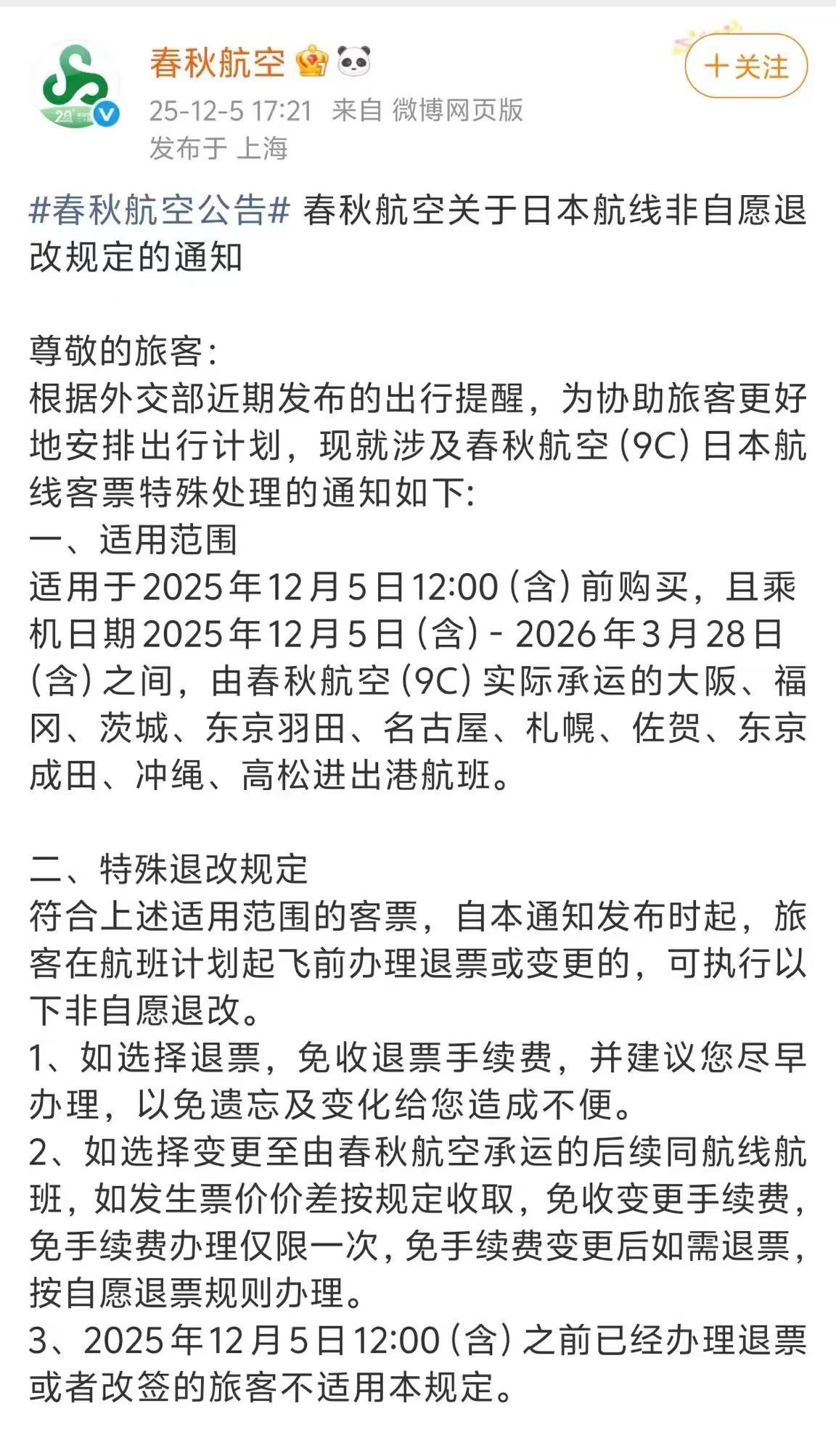 東航表示,為協助行程涉及日本航線的旅客更好地安排出行,現發布東航涉及日本航線進出航班客機機票的特殊處置方案,凡機票中至少含有一段未使用的涉及日本進港、出港或經停航班(包括東航、上航或其他航空公司航班),航班起飛日期在2025年11月15日至2026年3月28日期間的,可免費變更一次,退票則免收退票手續費。