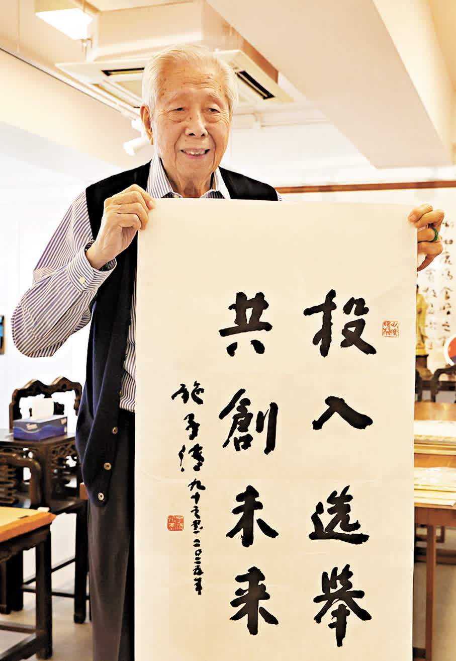 大紫荊勳賢、中國書協香港分會主席施子清接受訪問時,即席揮毫以書法表達對立法會選舉的期待,並呼籲市民踴躍投票,選出賢能之士,共同建設香港更美好的未來。