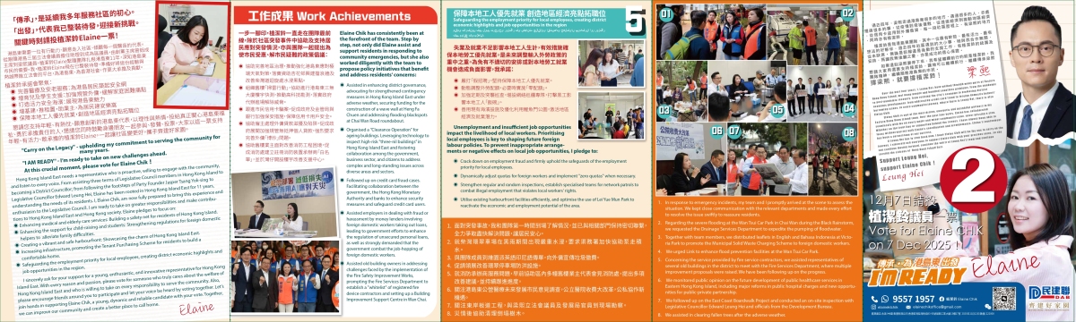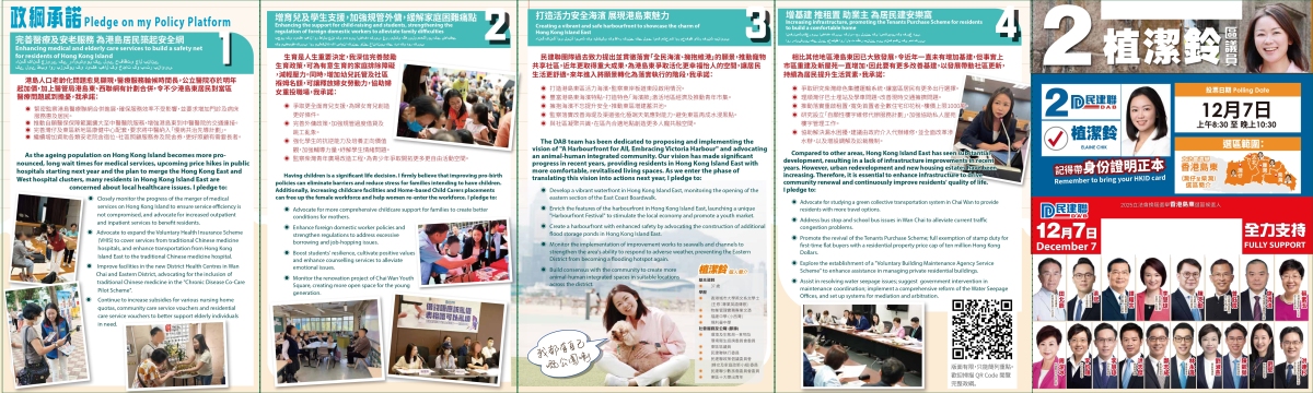 當區5號候選人,為民建聯派出的另一位女將、東區區議員李清霞。交通方面,她爭取優化鐵路事故罰則,賠償受影響乘客;爭取興建將軍澳132、137區至小西灣的地鐵線。經濟方面,她主張持續優化港島東北岸海濱長廊;增設智能燈柱、Wi-Fi熱點,推動電子支付;整合歷史建築與文化地標,發展文化旅遊;加快興建愛秩序灣體育館,滿足康樂需求;推動多元文化活動,促進族裔共融。此外,李清霞建議推行社區共建計劃,強化鄰里關係;研究重推「租置計劃」,加強舊區更新;運用科技提升治安管理,保障市民安全;加強國家安全教育,維護國家主權安全等。