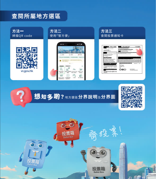 政府早前已向逾413萬名已登記選民寄出投票通知卡,選民只可在投票通知卡上列明的投票站投票。選民記得留意信箱或網上查詢去哪個票站投票。不清楚去哪個票站投票?快來查詢!查詢方法見下圖↓