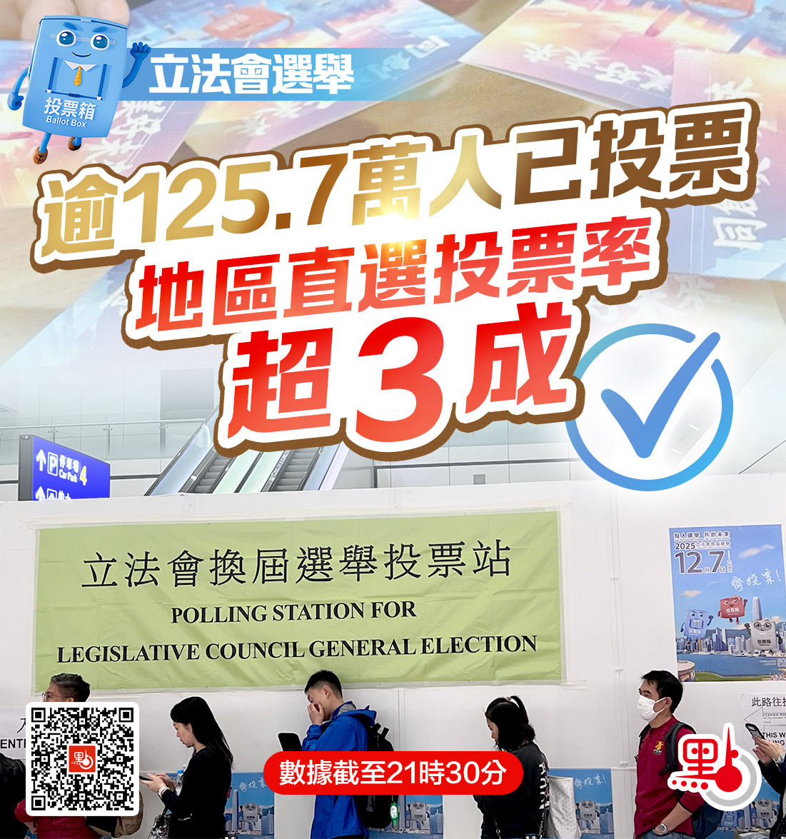 立法會選舉網站顯示,截至今晚9時30分,地方選區有1,257,039人投票,投票率達30.43%;功能界別有73,110人投票,投票率達38.09%;選舉委員會界別有1453人完成投票,投票率達99.11%。
