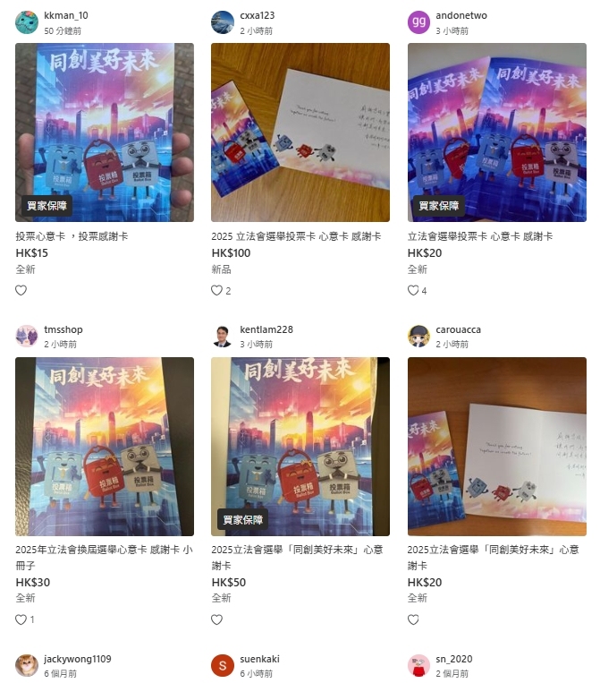 【點新聞報道】在今日(7日)立法會換屆選舉完成投票的市民,可獲發政府送贈的心意謝卡。有網上二手拍賣平台,出現轉賣心意謝卡的帖文,售價由10元至100元不等;亦有賣家同時發售多張心意謝卡。