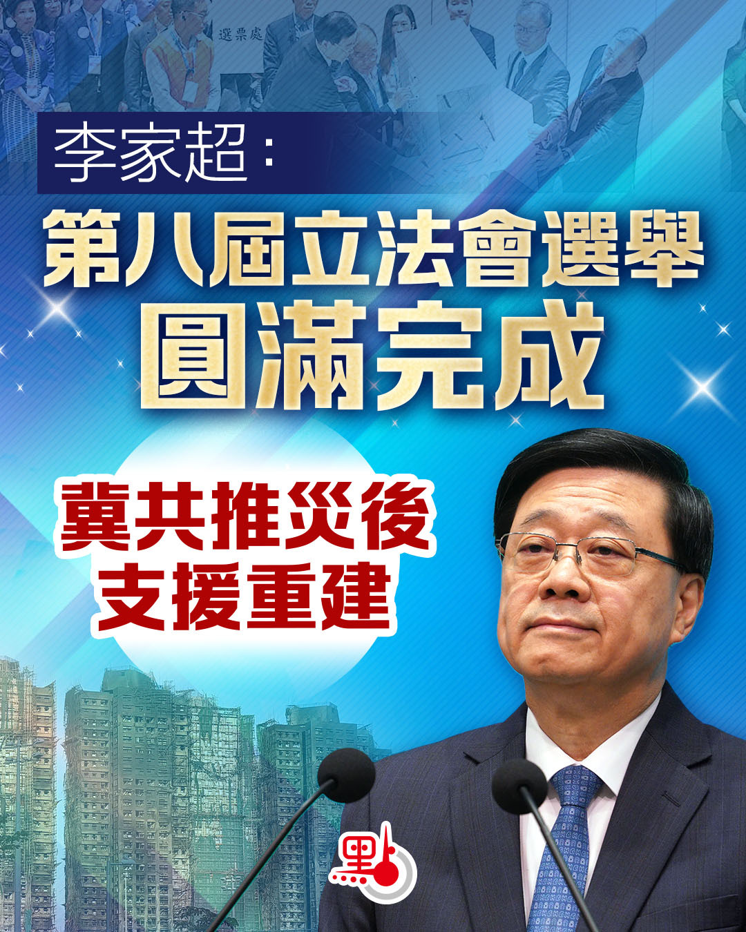 李家超指,在香港社會共同面對挑戰的時刻,選舉順利成功舉行具有深刻意義,體現選民支持政府災後重建和改革向前的決心,支持選出有能力、有抱負的立法會議員支援災民和善後重建,推動制度改革,亦展現出市民團結一致和互愛互助的精神。