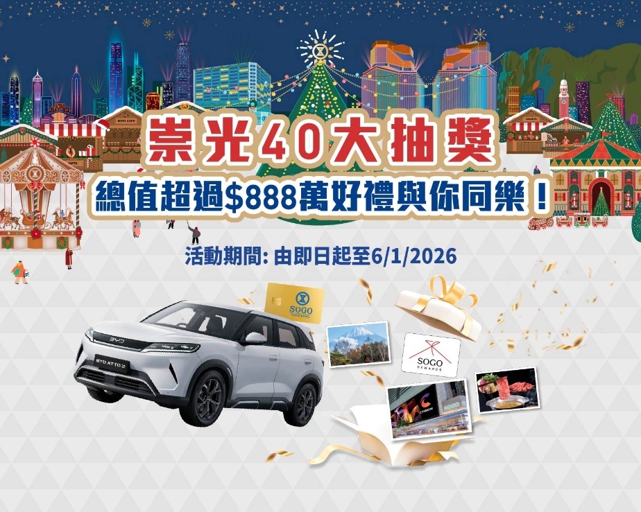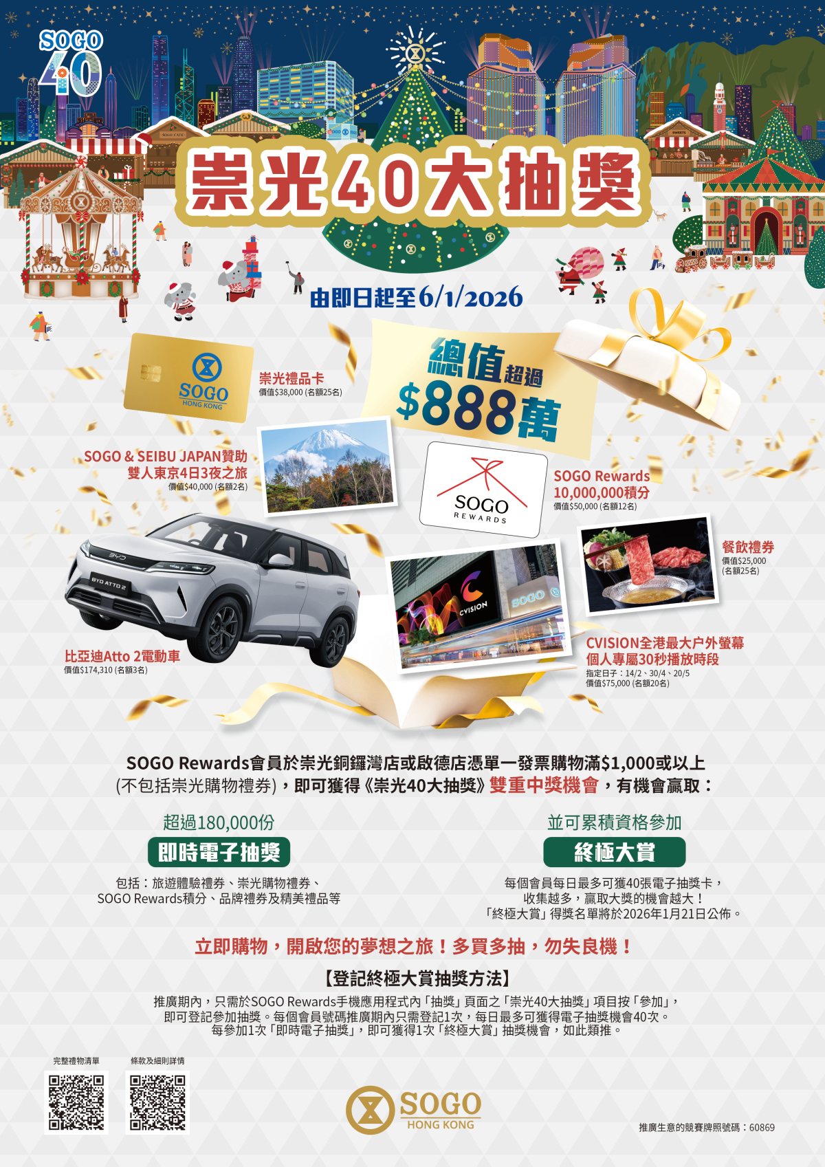顧客凡消費滿$1,000或以上,即可於SOGO Rewards手機應用程式內參與「終極大賞」及「即時電子抽獎」雙重抽獎。「終極大賞」送出近90份好禮,多項大獎包括:比亞迪ATTO 2全新純電動SUV 3部、CVISION全港最大户外螢幕個人專屬30秒播放時段20份;另外,更送出SOGO Rewards會員1,000萬積分(價值$50,000)12份、SOGO&SEIBU JAPAN贊助雙人東京4日3夜之旅(來回機票,包1日體驗行程,價值$40,000)2份、崇光禮品卡(價值$38,000)25份及崇光餐飲禮券(價值$25,000)25份等等,抽獎結果將於2026年1月公布。