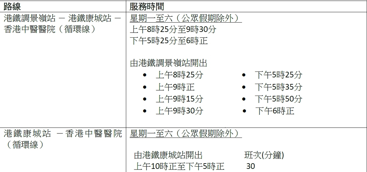 港鐵調景嶺站-港鐵康城站-香港中醫醫院、港鐵康城站-香港中醫醫院兩條循環線星期一至六(公眾假期除外)提供免費接駁服務。