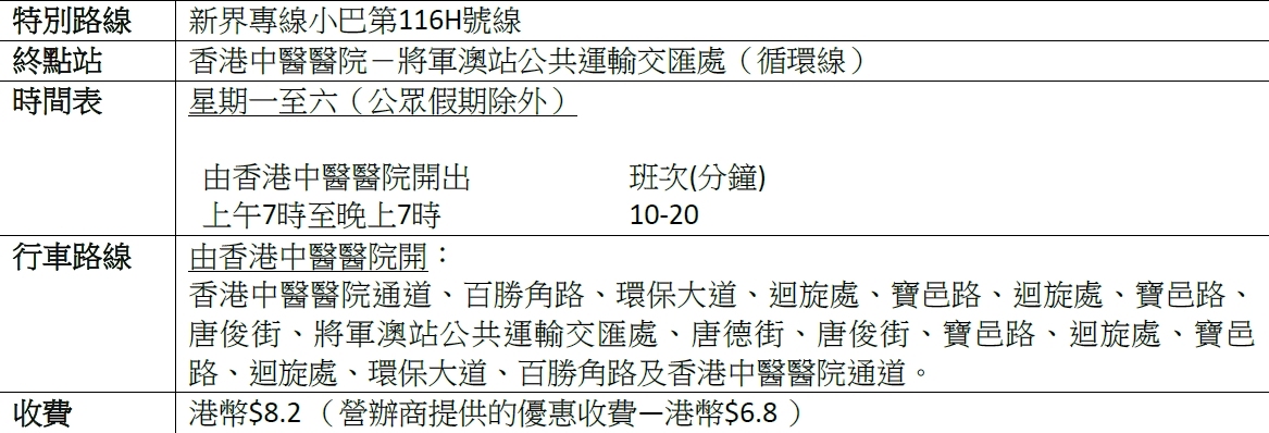新界專線小巴第116號線的特別路線,即第116H號線(香港中醫醫院-將軍澳站公共運輸交匯處(循環線))將投入服務。服務詳情如下: