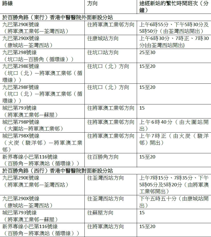 九巴290E、290X、298、298E、298F、793、798P、798X等行經百勝角路的路線將於香港中醫醫院附近新設分站;九巴290E、290X、793等將於百勝角路(西行)香港中醫醫院對面新設分站。