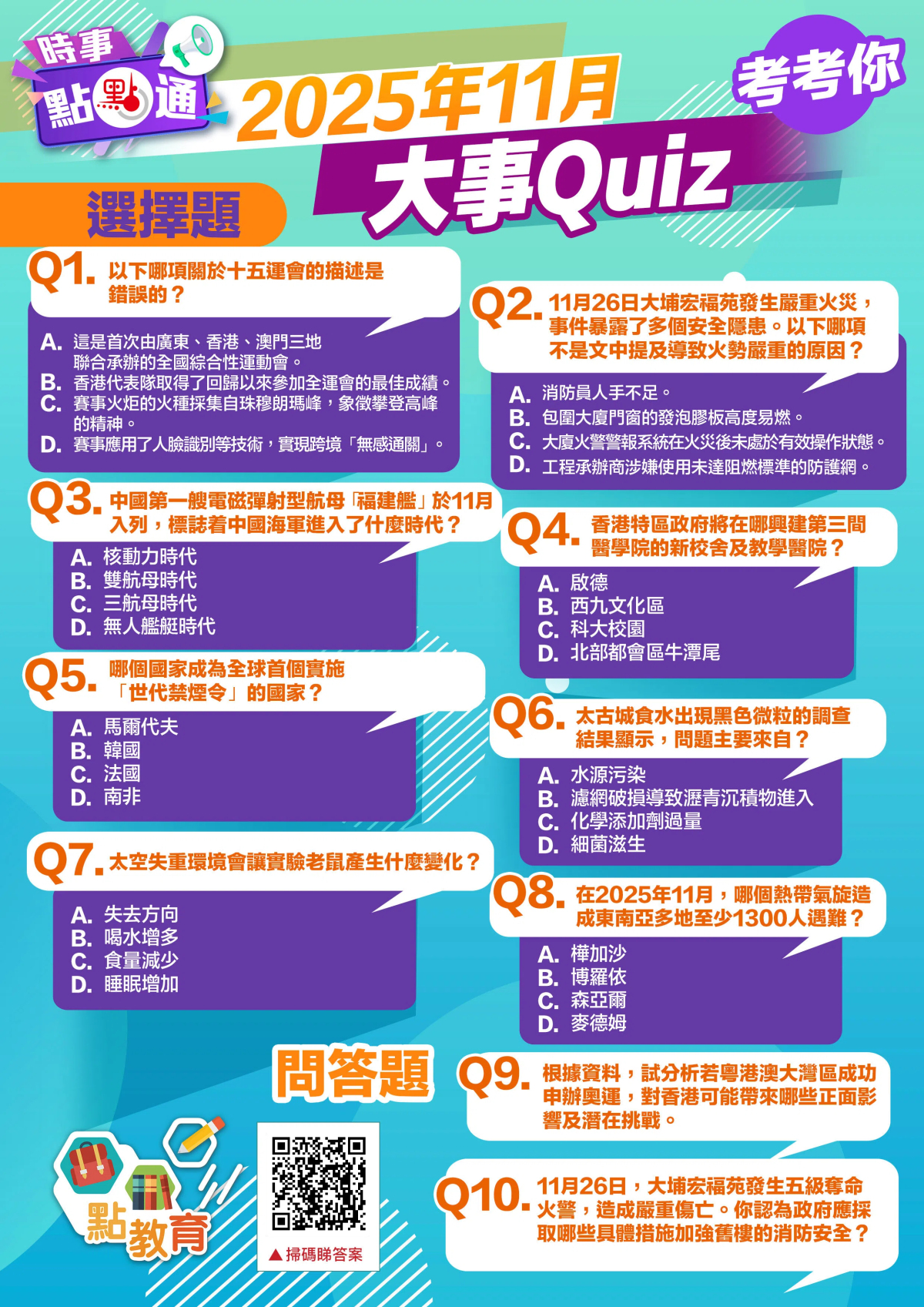 【編者按】點教育於2025/26學年開始,推出全新「時事點點通」欄目,精心篩選並總結每月港澳、兩岸及國際的重點新聞,助學生輕鬆掌握世界脈搏。本期欄目將繼續為你精心篩選並剖析11月的港澳、兩岸及國際重點新聞。各位同學可通過點擊表格內文字,閱讀詳細新聞報道。最後,別忘了完成「考考你」小測驗,即時鞏固學習成果,備戰考試自然更得心應手!