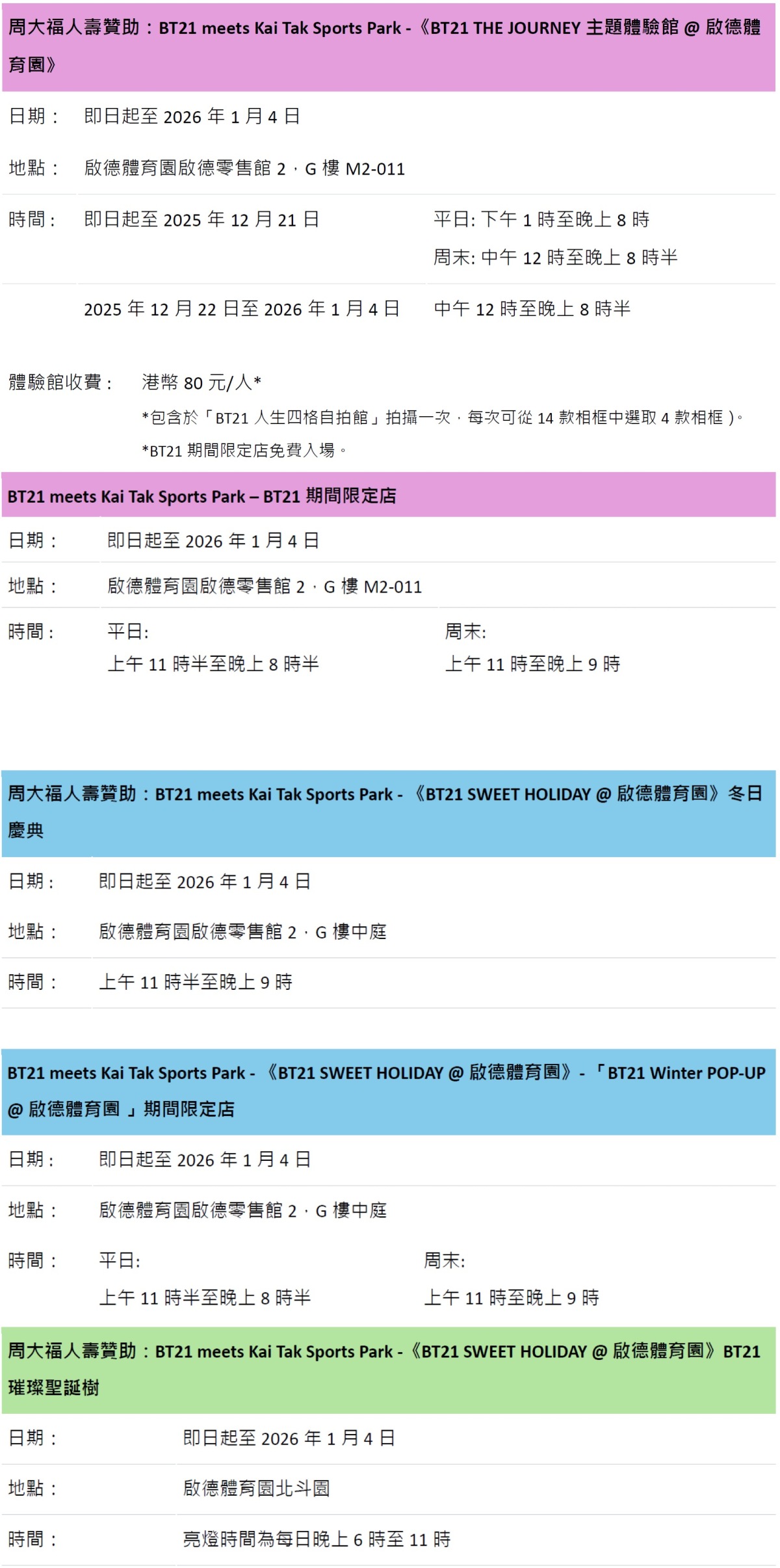 BT21主題打卡位將於即日起至2026年1月4日登陸啟德零售館2樓中庭,而且「BT21 Winter POP-UP」期間限定店亦於即日起營運,由毛公仔、鎖匙扣吊飾、擺設、文具至生活用品,款式應有盡有。此外,啟德體育園將帶來全港首棵以「BT21 SWEET HOLIDAY」為主題的7米高戶外「BT21璀璨聖誕樹」,樹上掛滿以BT21成員可愛薑餅造型所設計的裝飾,同時,7位換上冬日造型的BT21成員更齊聚大樹下迎接大家。零售館中更有4米高的巨型RJ及換上冬日造型的BT21成員KOYA、RJ、SHOOKY、MANG、CHIMMY、TATA與COOKY!