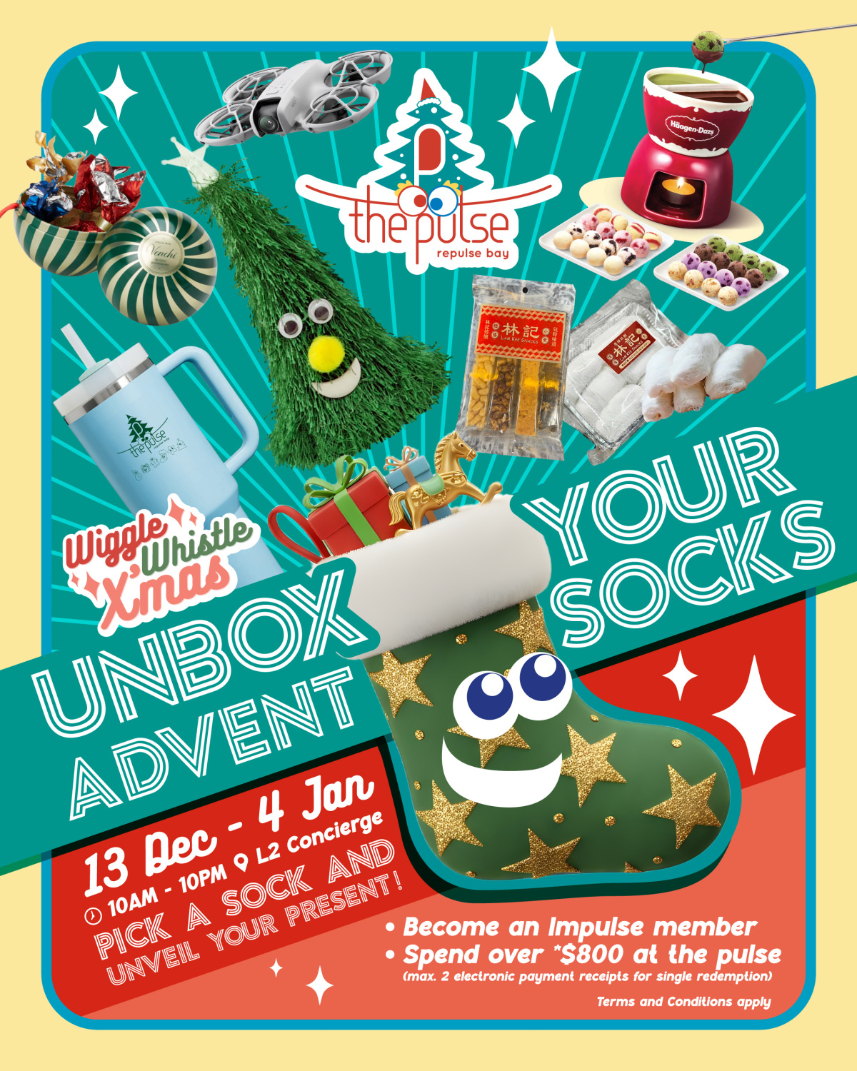 今個聖誕,淺水灣灘畔商場the pulse將於12月13日至1月18日化身溫暖又充滿驚喜的冬日樂園Wiggle-Whistle Xmas!場內設置3大互動願望收集站,大小朋友只要誠心Make a Wish,你的願望將被化作光和音樂,喚醒藏在樂園內的願望守護精靈。聖誕樹、聖誕襪及大頭帽將隨着你的願望活力甦醒,一同搖擺、歌唱,打造獨一無二的節日奇幻體驗。