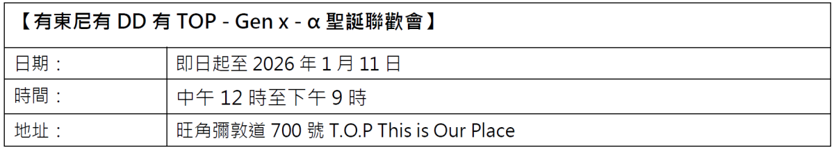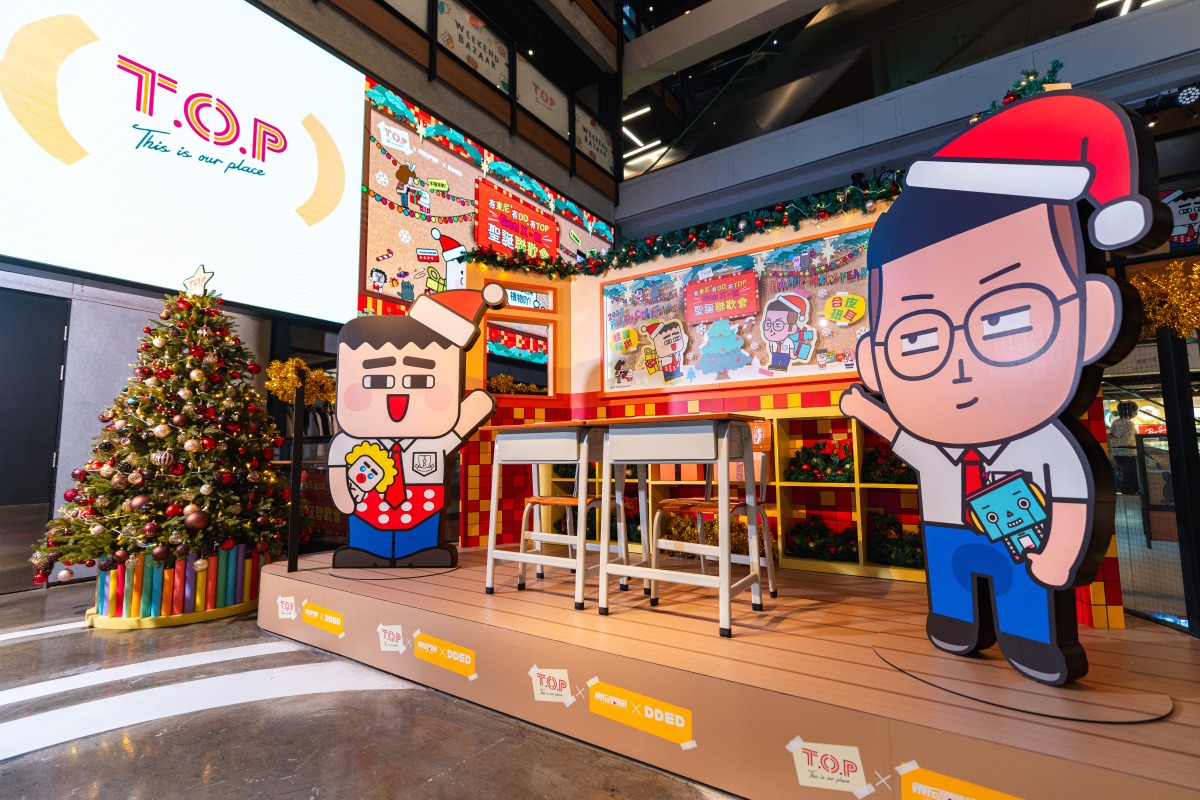 今年聖誕,T.O.P再度聯乘兩大鬼馬插畫家「東尼電機」及DDED,打造全港最長聖誕聯歡會。兩位創作人以幽默、創意及本土文化為核心,曾推出爆紅「懷孕動物」盲盒及「打工仔扮工牌」等原創玩具,深受年輕族群喜愛。即日起至2026年1月11日,聖誕聯歡會正式登場。商場各樓層化身「T.O.P中學」,並設有四大搞怪打卡位,包括商場1樓的課室裝置中有換上校服的東尼和DDED,5樓空中花園有全球首度亮相的3米高聖誕仙人學校村,記得準備士的糖參拜聖誕仙人保佑交換禮物運,2樓有韓國大熱的熱感紙即影即有,4樓壁報留言板可留言聖誕願望。聖誕節怎少得了音樂相伴?T.O.P特別為聖誕月準備了一連串精彩節目,12月將有新晉韓星金施勲粉絲見面會及人氣歌手Busking活動,讓大家在悠揚樂韻中愜意歡度聖誕。