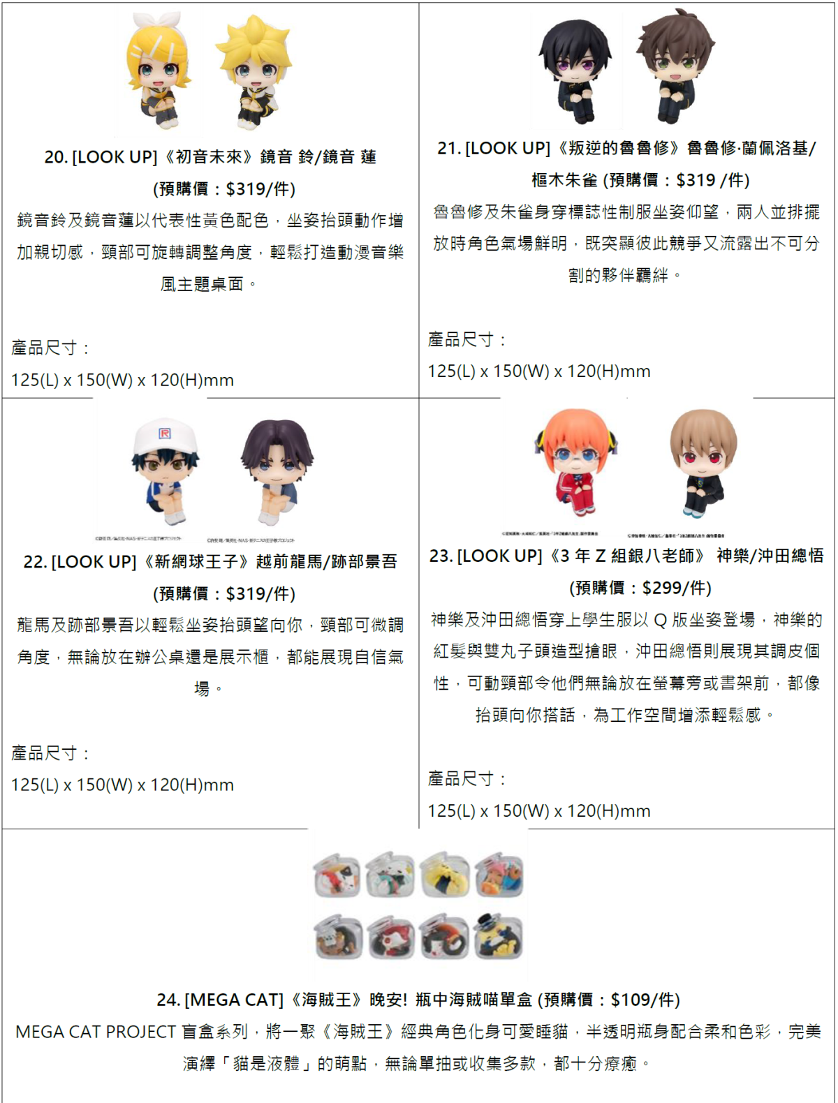 另外,「7仔預購」也為一眾動漫迷帶來「LOOK UP」系列模型大集合,多部人氣作品角色齊齊坐鎮,包括《鏈鋸人》、《TIGER&BUNNY》、《排球少年!!》《海賊王》《初音未來》《叛逆的魯魯修》及《新網球王子》等,一次過網羅人氣角色。全系列以招牌坐姿仰望造型呈現,頸部設有可動關節,抬頭望着你的神情分外治癒,是粉絲必儲之選!預購將於12月10日起在「7仔預購」網店及7-Eleven App開放預購,切勿錯過!