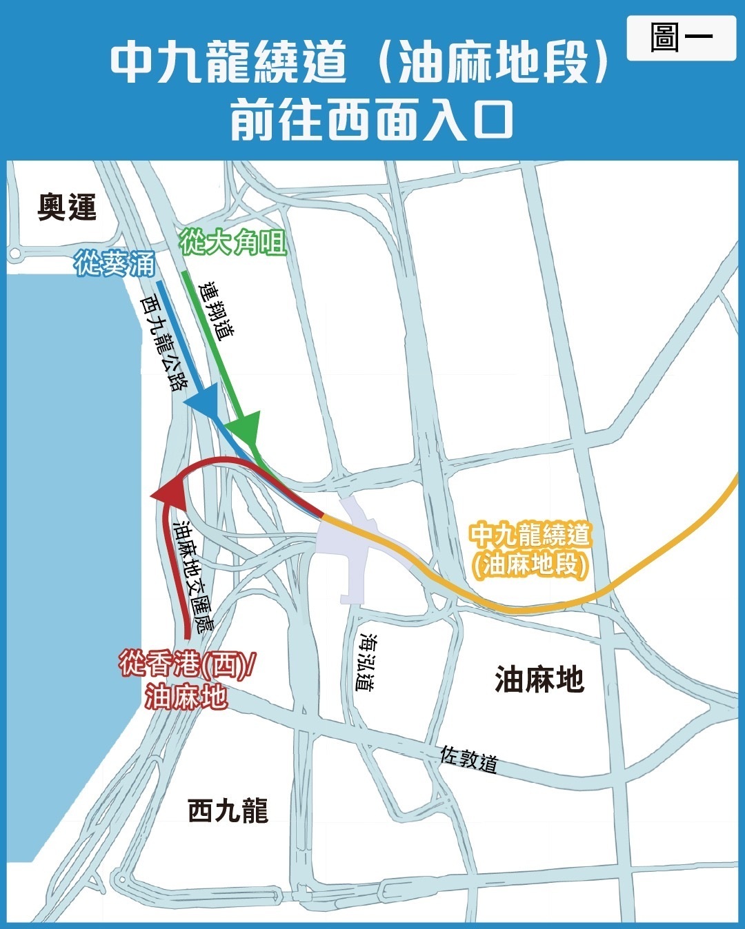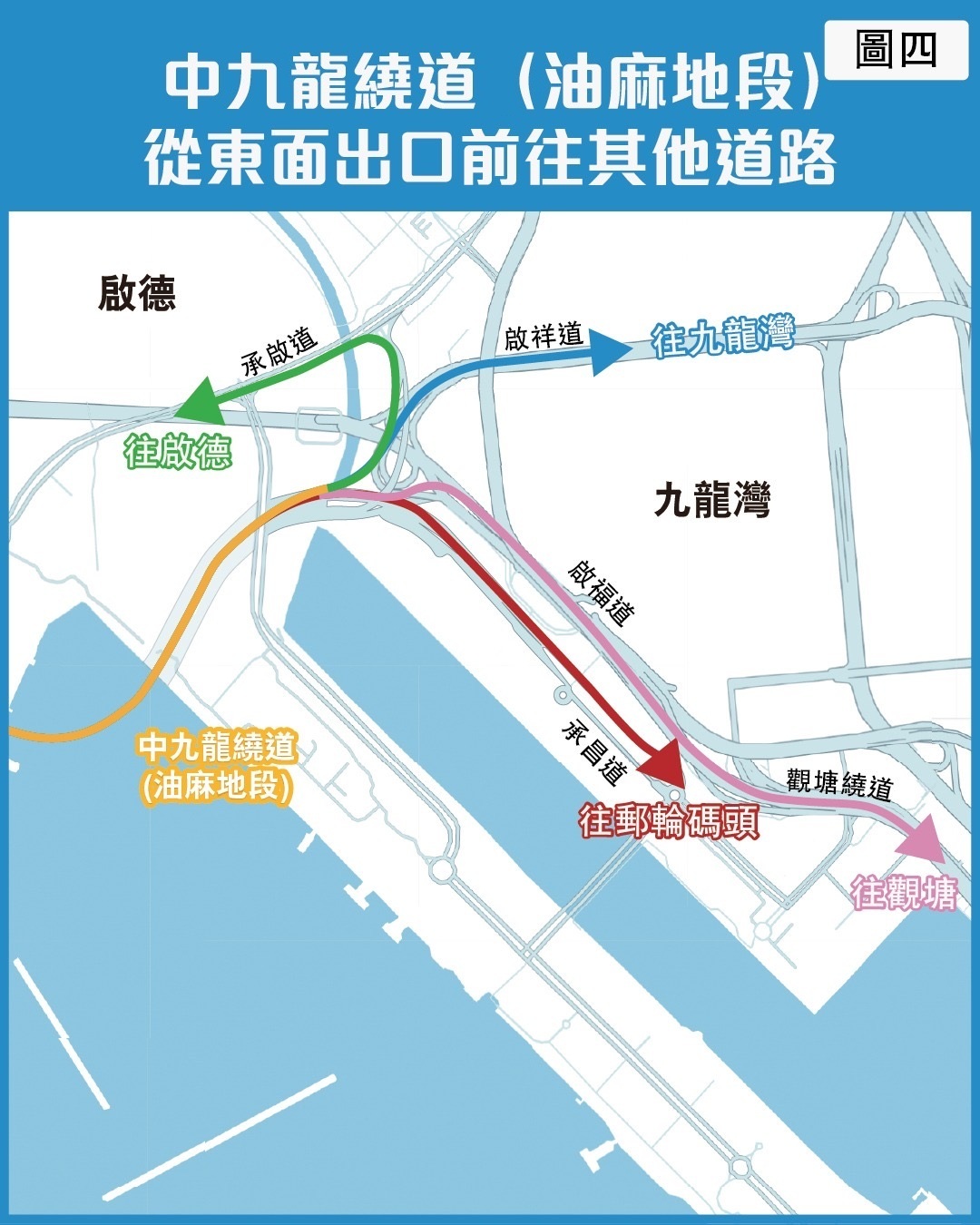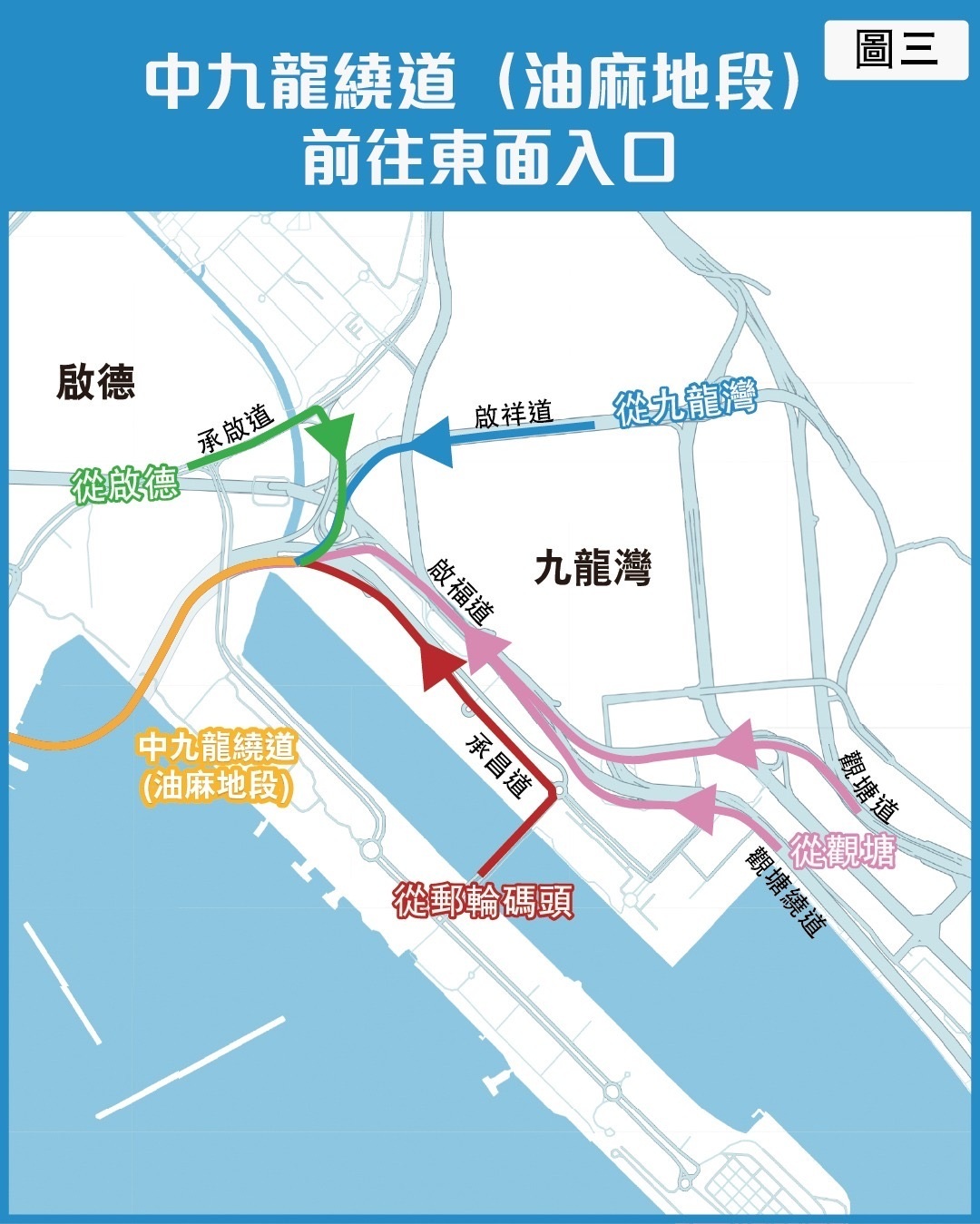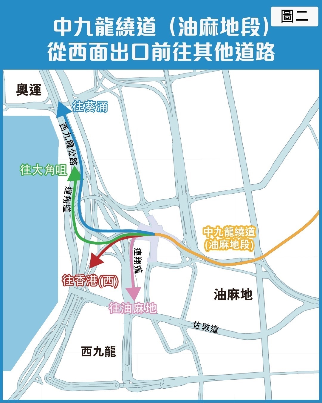 路政署提醒,中九龍繞道(油麻地段)開通後,駕駛人士可從油麻地交匯處經繞道及啟福道,直接駛往觀塘繞道。如用啟德隧道或啟祥道經啟福道往觀塘繞道,則需在「綠在觀塘」附近左轉入常怡道前往。