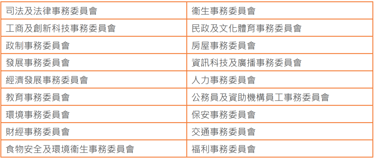 立法會設有18個事務委員會,負責監察及研究政府政策。事務委員會為議員提供討論政策事宜的議事場合,並負責研究與其相應政策局的政策範圍有關而又受公眾關注的事項。事務委員會所討論的事宜與市民的生活息息相關,包括衞生、教育、環境、交通及食物安全等。事務委員會的討論事項,可由委員提出、由內務委員會或其他委員會轉介、由政府建議,亦可由其他議員與區議會舉行會議或接獲投訴或意見書後提出。事務委員會亦聽取公眾的意見,如有需要,會與團體或個人會晤。