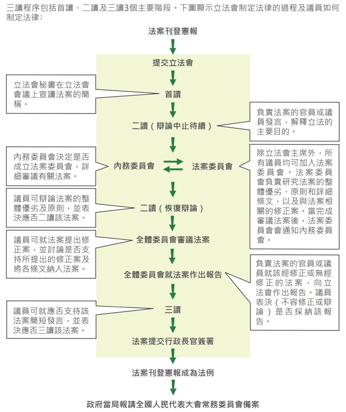 政府主要負責以法案的形式,將新訂法例或現行法例的修訂建議提交立法會審議,以制定成為法例。根據基本法第七十四條,凡不涉及公共開支或政治體制或政府運作的法案,可由立法會議員個別或聯名提出。至於涉及政府政策的法案,議員在提出前必須得到行政長官的書面同意。法案須於立法會完成三讀程序,才成為法律。