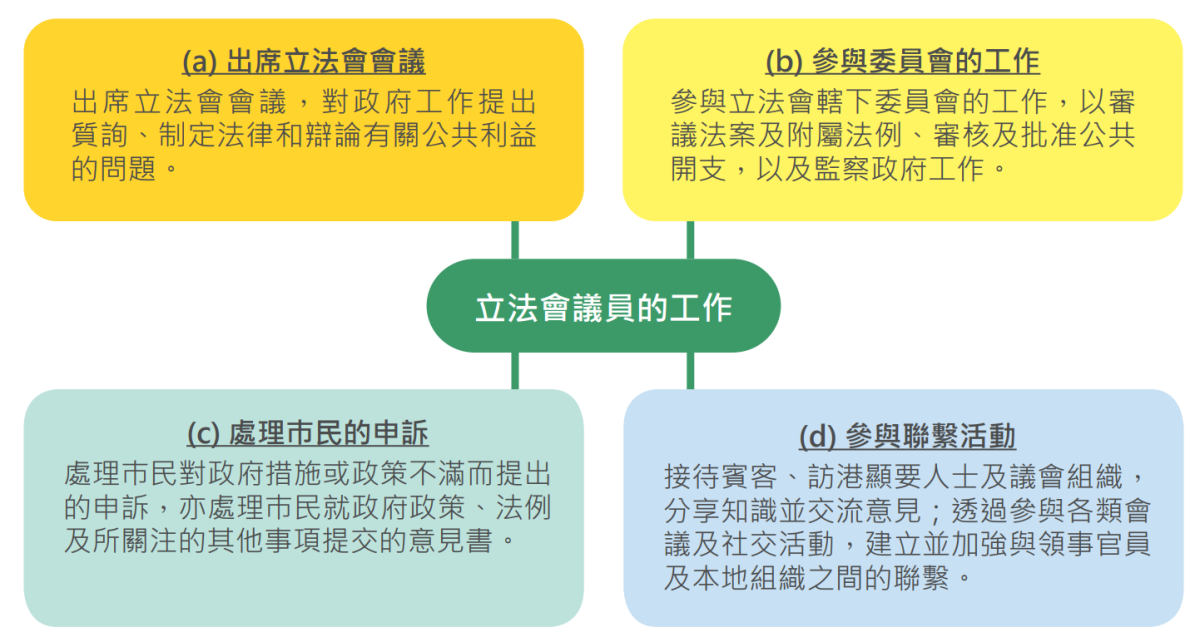 立法會的3項主要職能包括:制定法律,批准公共開支,及監察政府工作。