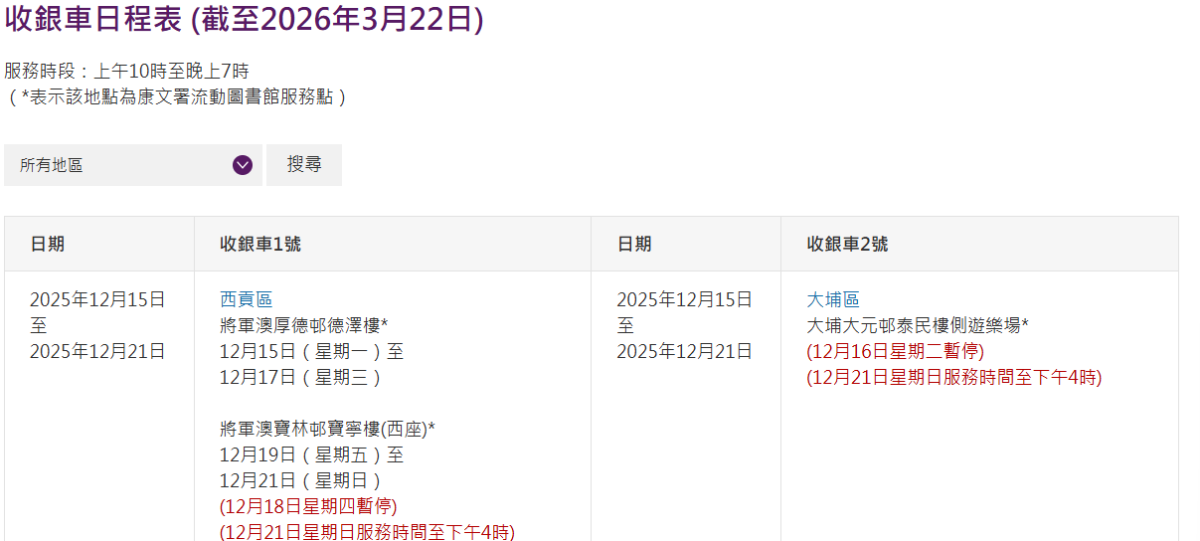 【點新聞報道】香港金融管理局今日(10日)宣布硬幣收集計劃下兩輛「收銀車」最新服務日程表,當中羅列由明年1月5日至3月22日各區服務地點;日程表及其他有關資訊,已載於金管局網頁。金管局會不時檢討計劃成效,並按時更新服務日程表以便預早通知市民。