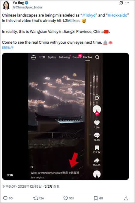 【點新聞報道】據觀察者網報道,近日,一段關於中國江西上饒望仙谷美景的視頻在外網爆火,但卻被很多賬號錯誤標註為日本「東京」或「北海道」。當地時間12月8日,中國駐印度大使館發言人宇靜在X平台上發帖闢謠:「這段已獲得130萬點讚的熱門視頻中,中國的風景被錯誤地標註為東京和北海道。實際上,這是中國江西的望仙谷。」