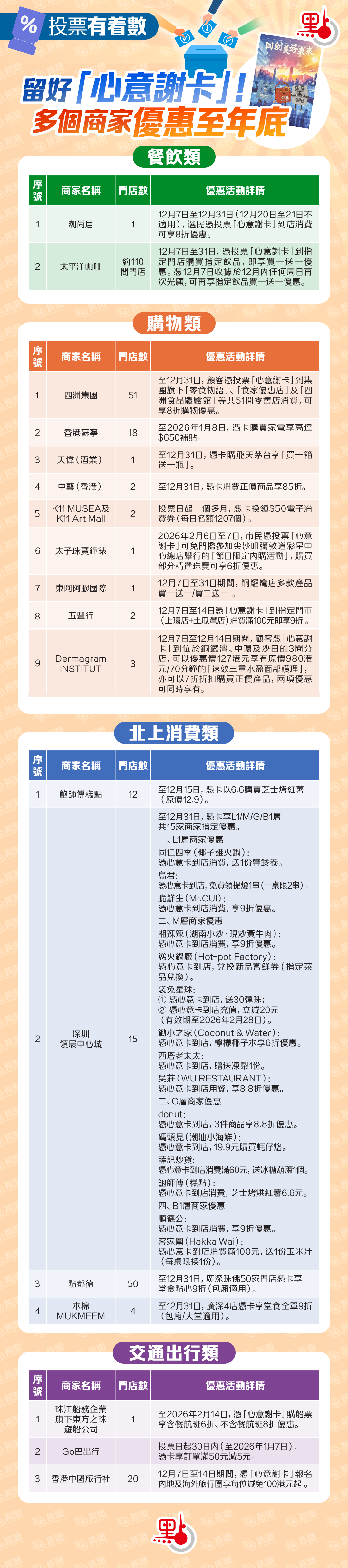 早前,香港大公文匯傳媒集團發起「投票有着數」活動,獲得了香港不同領域的企業支持。現在,只要拿著「心意謝卡」,仍有超過1800間門店提供優惠。這些門店覆蓋了餐飲、交通、旅遊、零售、美容等等領域。部分優惠甚至持續到了明年2月。