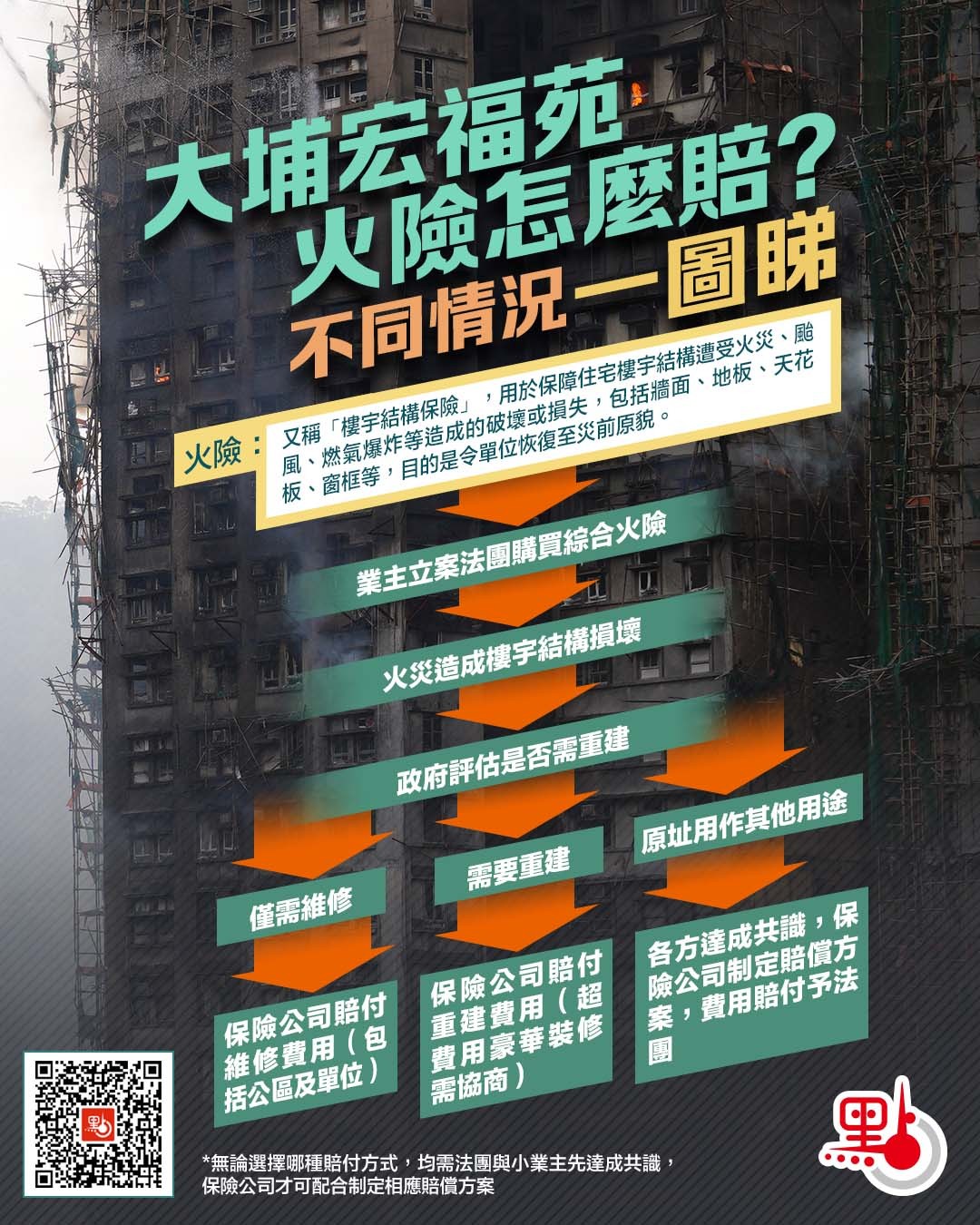 火險,又稱樓宇結構保險。劉佩玲介紹,火險的作用主要用來賠償樓宇結構重置的費用,包括牆面、天花板、地板、窗框等,目的是令單位得以恢復原貌。以宏福苑火災為例,大廈業主立案法團已購買全幢綜合火險,除了公共空間,個別單位賠付亦已包含在內,小業主原則上不需要再自行購買火險。
