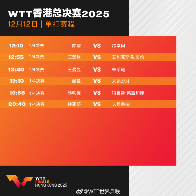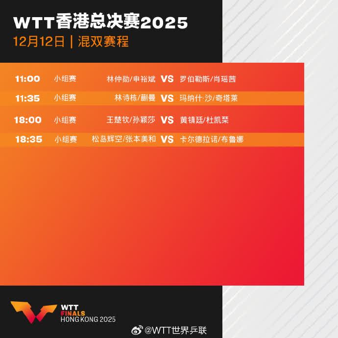 【點新聞報道】WTT香港總決賽2025今日(12日)比賽繼續。「黃杜配」黃鎮廷/杜凱琹今晚將對陣「莎頭組合」王楚欽/孫穎莎。具體賽程如下: