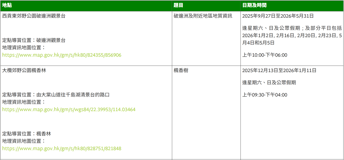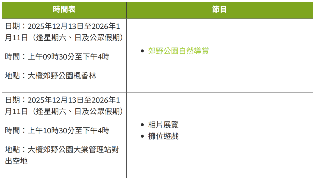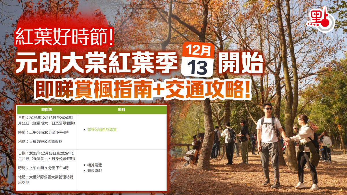 今年的賞楓活動將於12月13日至2026年1月11日舉行,大欖郊野公園大棠管理站對出空地設有相片展覽、攤位遊戲等活動,有得玩又可以同紅葉打卡,一舉兩得!另一活動「郊野公園自然導賞」則將在12月13日至2026年1月11日舉行,導賞路線由大棠山道往千島湖清景台的路口,即場參與,無需報名。