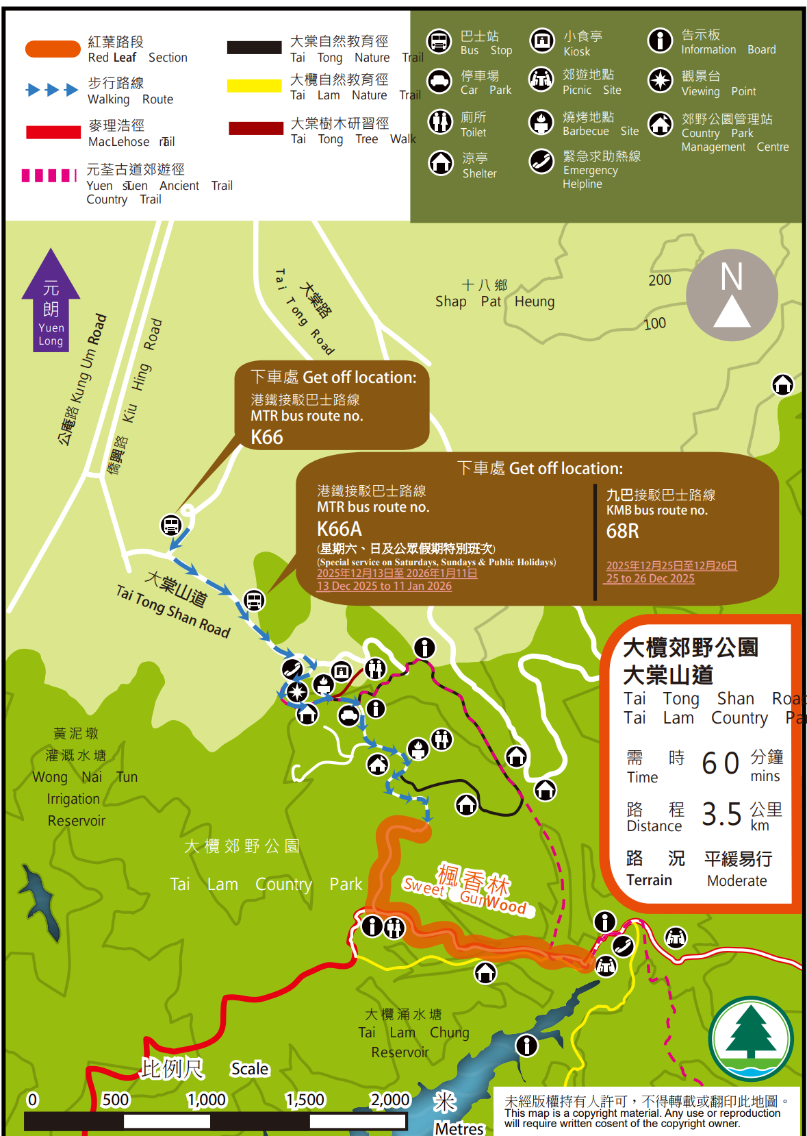 適逢紅葉潮,港鐵巴士推出期間特別專線K66A巴士,由朗屏站直達大棠山道站,由12月13日起投入服務至2026年1月11日,逢周六、日及公眾假期行駛。於大棠山路站下車後,沿大棠山道旁的行人道步行上山,約60分鐘到達楓香林。