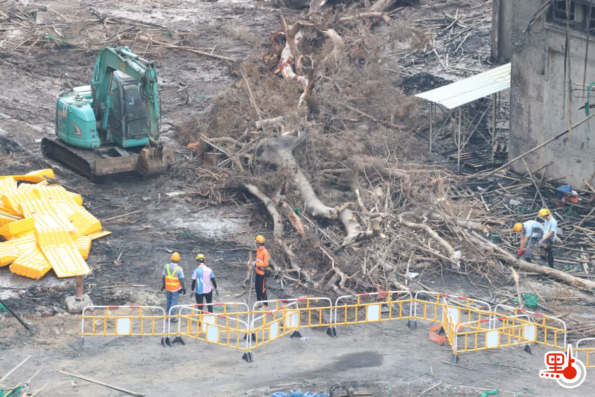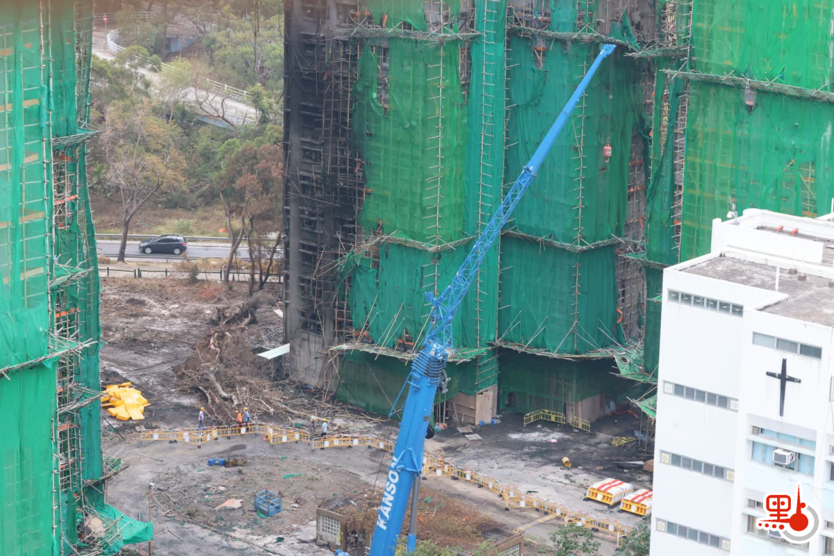 【點新聞報道】大埔宏福苑發生五級火警,8幢大廈中有7幢受到不同程度損毀。今日(13日),災場清理工作繼續,現場所見有大批穿着反光衣及戴頭盔工人四處走動;有工程車升高吊臂伸至大廈中層單位外牆位置;有挖泥車在地面清理棚架等雜物,並將燒毀樹木推倒運走;另有工人到未受大火波及的宏志閣天台進行作業。
