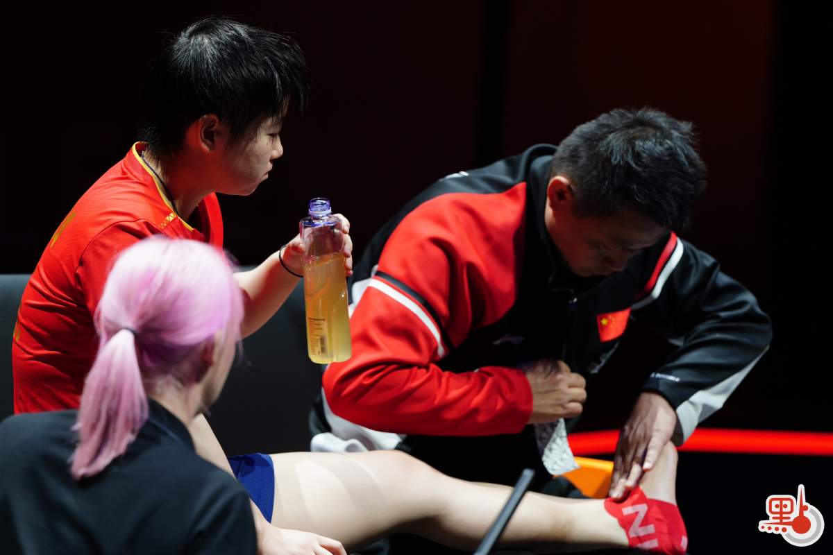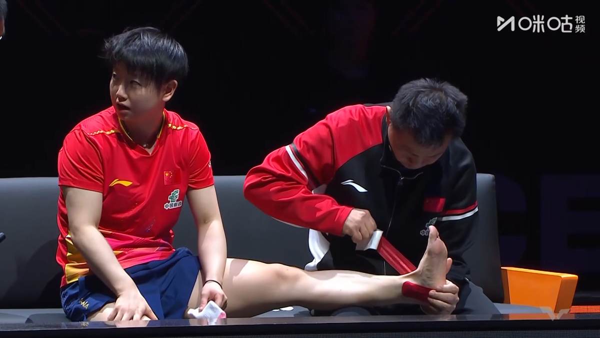第三盤結束後,孫穎莎腳踝不適,請求了醫療暫停,隨後纏上了繃帶,堅持比賽。