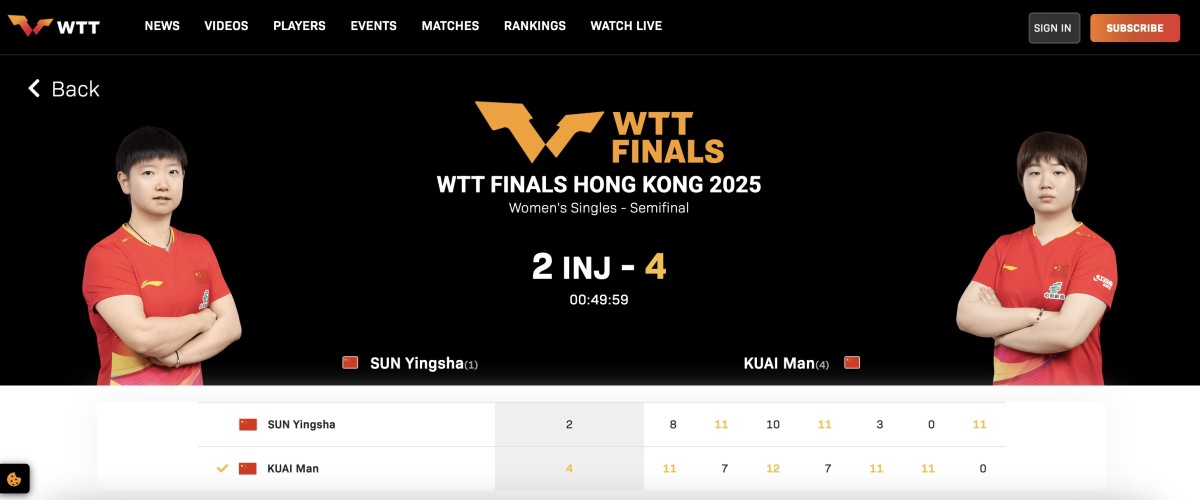 【點新聞報道】WTT香港總決賽2025今日(13日)比賽繼續。國乒新星蒯曼今晚出戰女單半決賽,對陣國乒名將孫穎莎。雙方賽況膠着,惟孫穎莎因腳傷退出比賽,蒯曼晉級女單決賽。