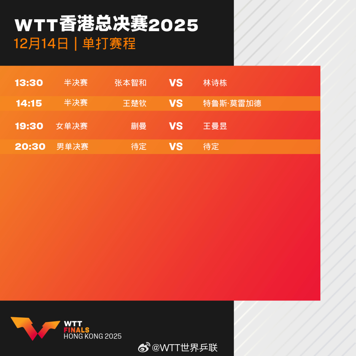【點新聞報道】WTT香港總決賽2025今晚(14日)將迎來收官之戰。今晚7時30分,蒯曼與王曼昱將角逐女單冠軍,國乒提前包攬金牌與銀牌。而男單半決賽方面,林詩棟將於下午1時30分率先對戰張本智和,王楚欽將於下午2時15分迎戰特魯斯·莫雷加德,勝者將晉級今晚8時30分舉辦的男單決賽,爭奪冠軍。具體賽程如下: