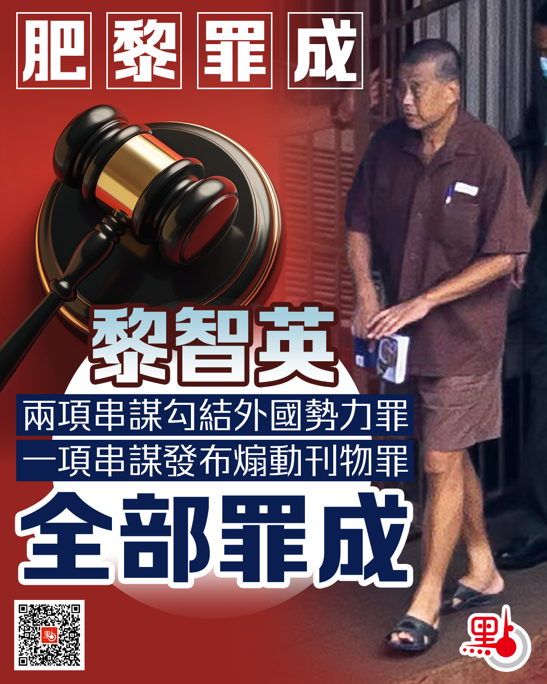 【點新聞報道】壹傳媒集團創辦人黎智英與《蘋果日報》3間相關公司涉嫌串謀勾結外國勢力案,審訊歷時156天,今天(15日)上午10時在西九龍裁判法院(暫代高等法院)由高院原訟法庭三名國安法指定法官杜麗冰、李素蘭和李運騰組成的合議庭裁決。三名國安法指定法官裁定黎智英兩項串謀勾結外國勢力罪及一項串謀發布煽動刊物罪成立,黎智英三項罪名全部罪成。