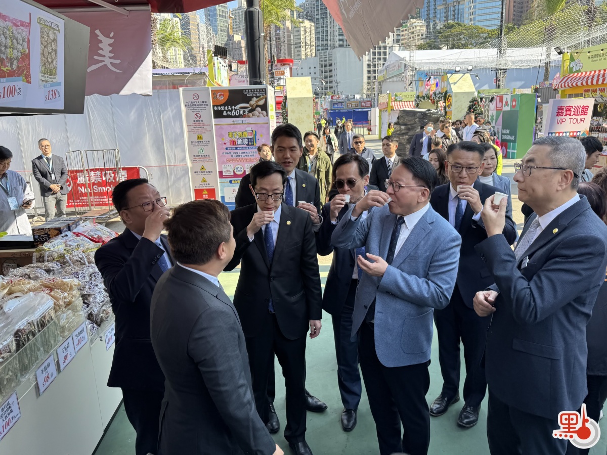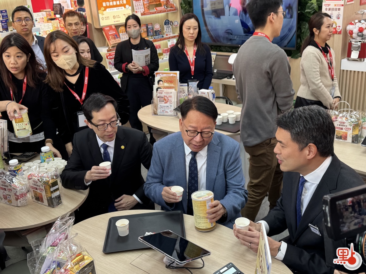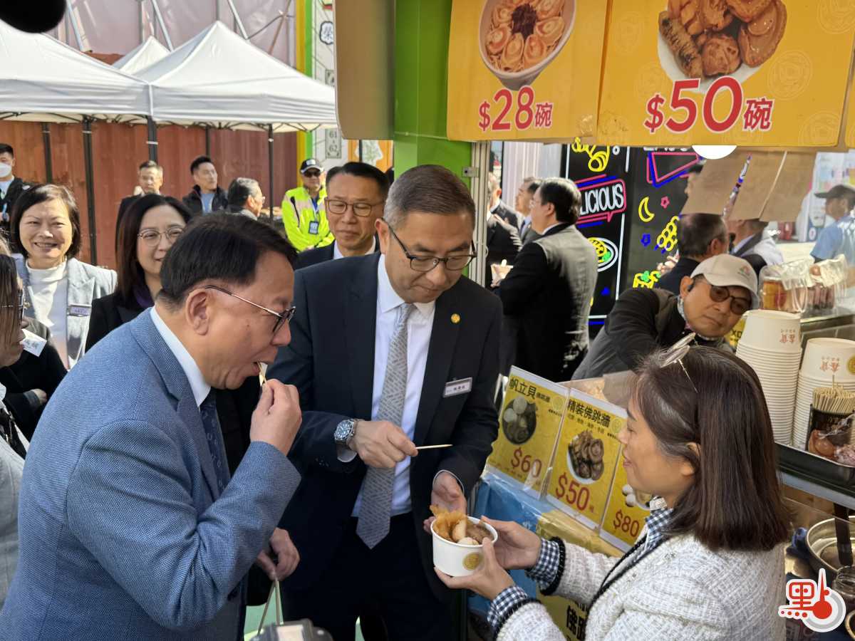 陳國基一行人熱情地與會場商戶打招呼,並品嘗佛跳牆、花膠雞湯、飲品等,陳國基對品嘗到的美食讚不絕口,並表示要支持香港本地品牌,亦期待會展的表現。