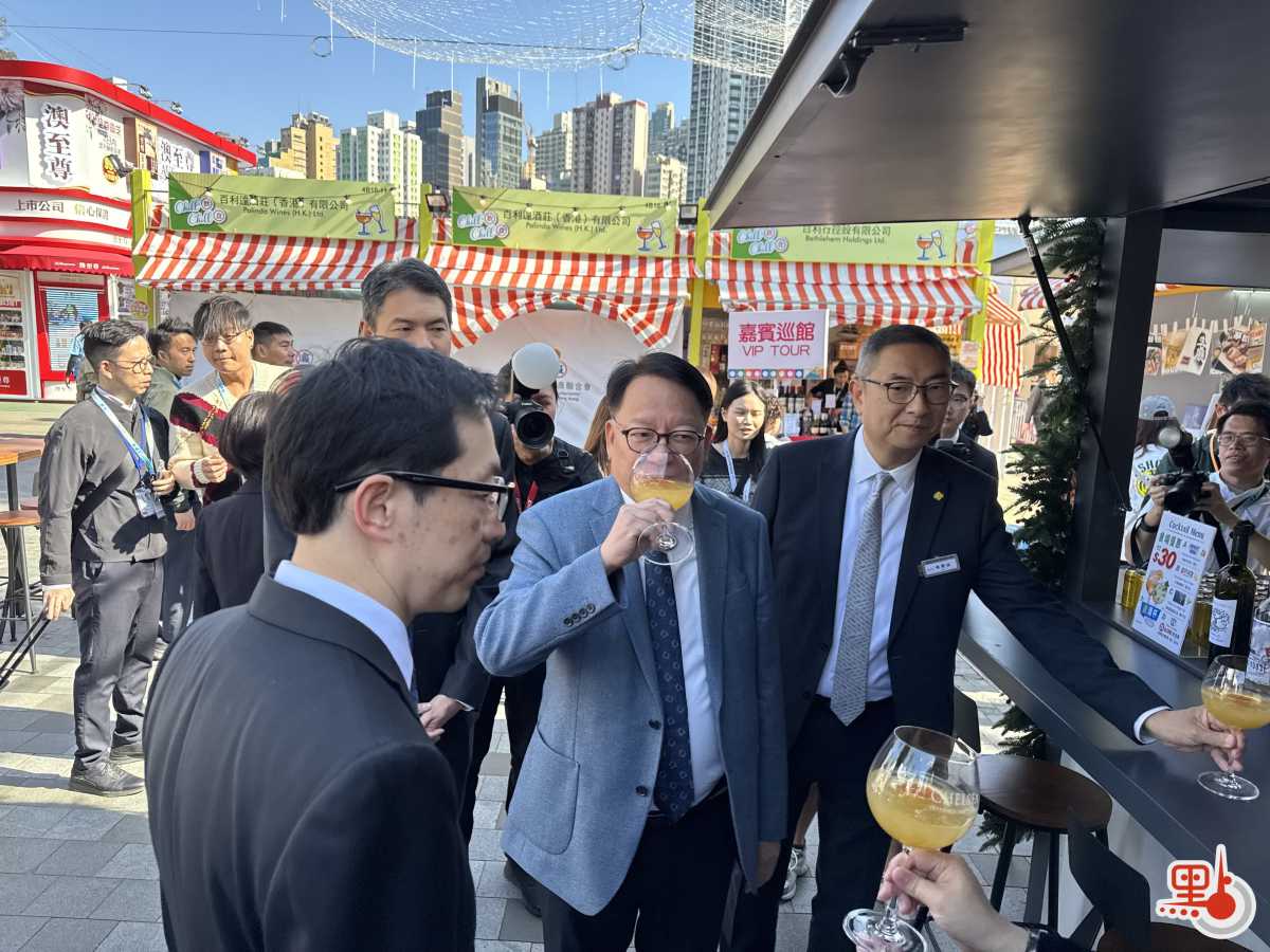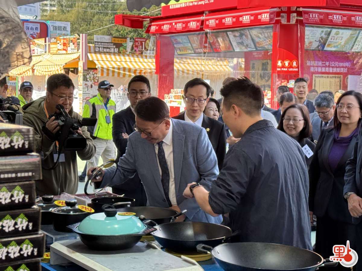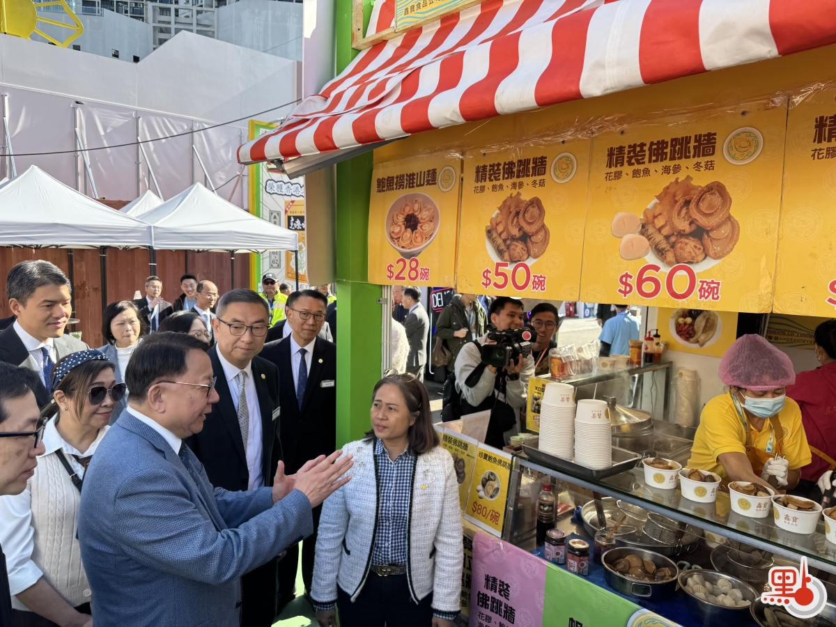 陳國基一行人熱情地與會場商戶打招呼,並品嘗佛跳牆、花膠雞湯、飲品等,陳國基對品嘗到的美食讚不絕口,並表示要支持香港本地品牌,亦期待會展的表現。