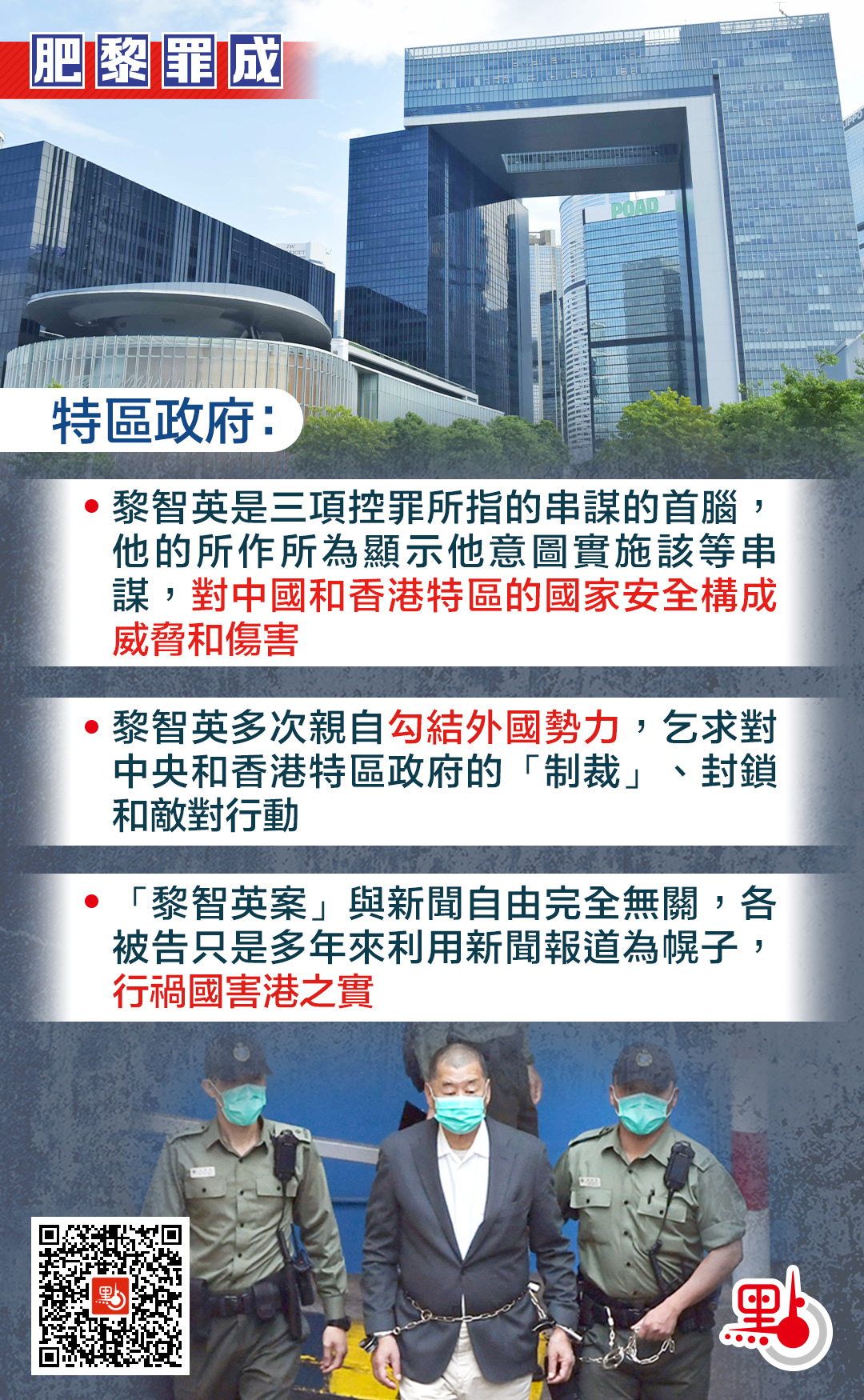 特區政府發言人指出,特區政府留意到在「黎智英案」的執法、檢控、審判各個階段,均有來自四方八面的抹黑攻擊、干預施壓,特別是以美西方為首的外部勢力一直不斷抹黑香港特區的執法行動和司法程序,又以卑劣政治操弄和謊言企圖美化黎智英及其團夥的犯罪行為,更以所謂的「制裁」恫嚇法官、檢控官、執法人員及其他特區政府官員,試圖干預香港特區法院依法進行審判,作出妨礙司法公正和破壞法治的行為。任何合理、明辨是非的人,只要詳細了解法庭今天頒下的裁決理由,都會認同法庭審判不偏不倚;外部勢力的卑鄙圖謀終會徒勞無功,不攻自破。