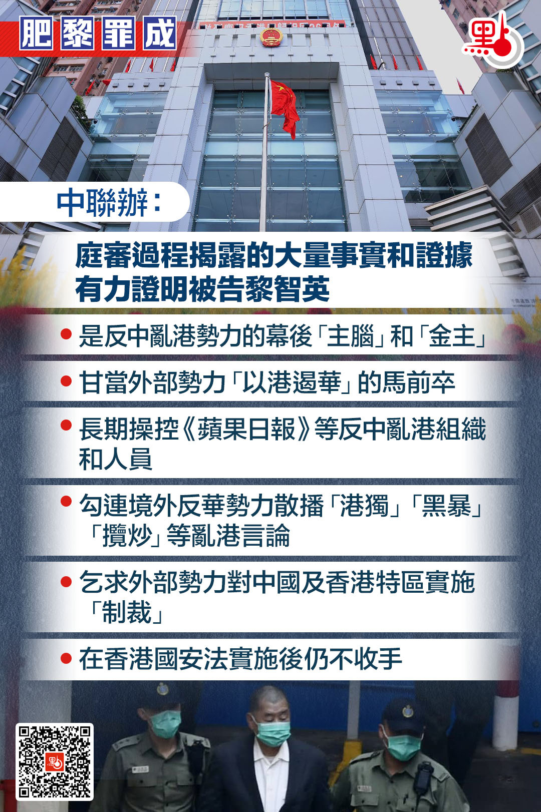 發言人指出,該案是香港首宗觸犯香港國安法規定的勾結外部勢力危害國家安全犯罪案件。庭審過程揭露的大量事實和證據有力證明,被告黎智英是反中亂港勢力的幕後「主腦」和「金主」,甘當外部勢力「以港遏華」的馬前卒,長期操控《蘋果日報》等反中亂港組織和人員,勾連境外反華勢力,散播「港獨」「黑暴」「攬炒」等亂港言論,意圖煽動他人顛覆特區政權,甚至直接下場組織對抗行動,乞求外部勢力對中國及香港特區實施「制裁」,在香港國安法實施後仍不收手。其罪行給香港社會造成嚴重傷害,給香港市民留下徹骨之痛,必須依法受到追究懲處。特區司法機構對黎智英依法定罪,維護國家安全,捍衛法治尊嚴,香港社會各界同聲支持,廣大市民拍手稱快。