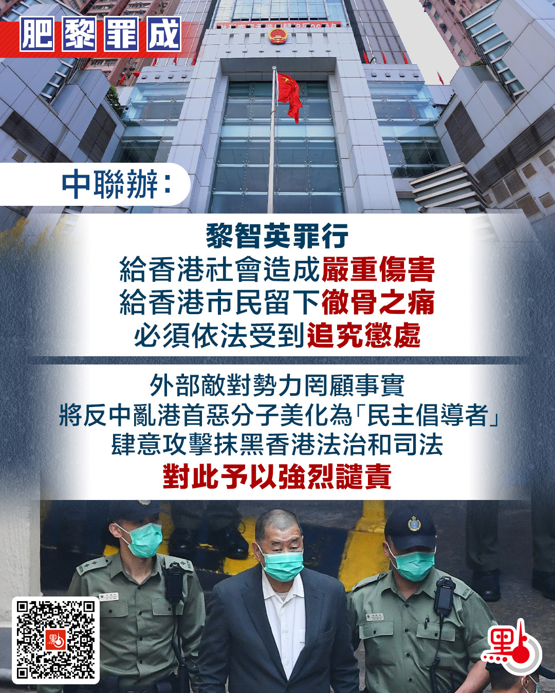 發言人強調,當前香港特區政府正帶領社會各界全力拚經濟、謀發展、惠民生,全力開展救災善後工作,但一些反中亂港分子和別有用心者散布謠言,攻擊政府,煽惑民眾,妄圖擾亂社會秩序,危害國家安全。特區司法機構此次對黎智英依法定罪,再次宣示了對危害國家安全的行為和活動零容忍的態度。這也是對反中亂港分子的嚴正警告,一切危害國家安全的行徑都必受到法律的嚴懲!
