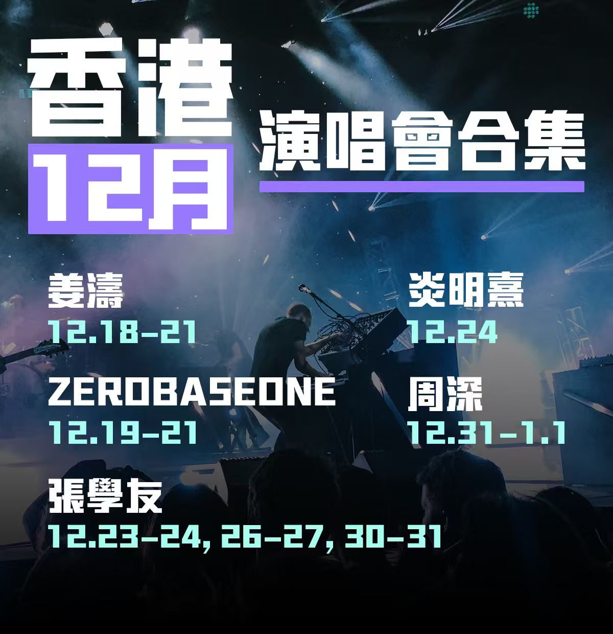 2025年的最後半個月,香港將有一大波演唱會來襲,迎接年末壓軸狂歡!本周,MIRROR人氣王姜濤《LAVA》主題演唱會將連開4場;新生代男團ZEROBASEONE將進駐啟德體育園;更有「歌神」張學友將於紅館舉行巡迴演唱會香港終章,為超過兩年的世界巡演劃上圓滿句號。而內地歌手周深也將在啟德體育園帶來跨年演唱會。12月的香港有超過15場演出在紅館、亞博館、啟德三大場館與戶外場地舉行。這個聖誕與跨年,香港將以「本地天王天后+日韓頂流+跨年盛典」的豪華陣容,為2025年畫上星光璀璨的句號,開啟2026年的音樂新篇章。