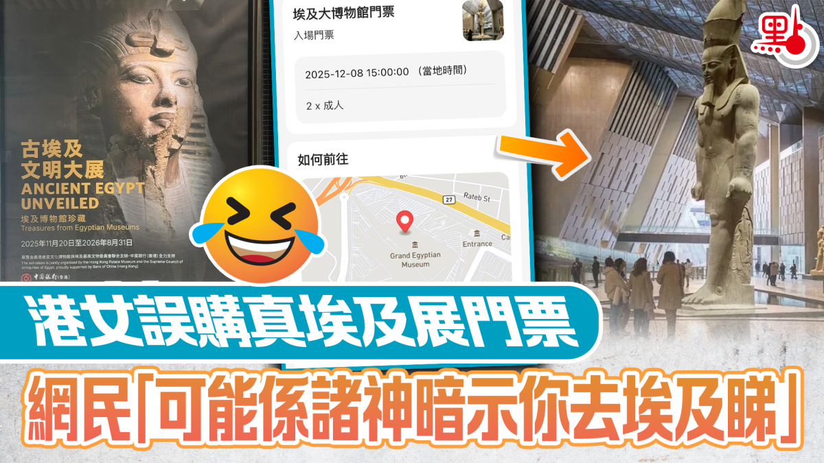 事主表示,她提前在網站klook上購買了展覽門票,到場後經職員多次掃碼卻仍無法入場。最後職員認真查看發現門票價錢處的標價不對勁,「咦?點解個(價)錢係1450蚊嘅?咩嚟㗎?」,原來是事主誤購了位於埃及吉薩的「埃及大博物館(大埃及博物館)門票」,而非本港的「古埃及文明大展」門票。對此事主無奈自嘲「我真係笑死」,並戲言「我人生第一次覺得自己咁弱智…我有病,我仲有冇得醫?」