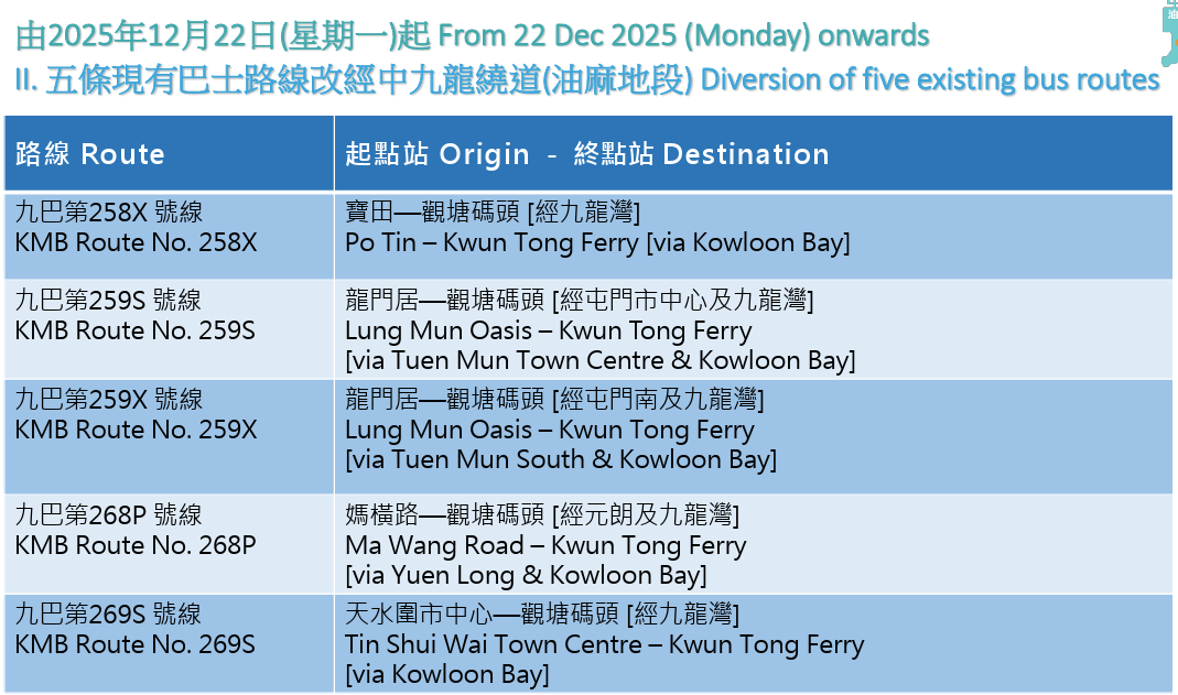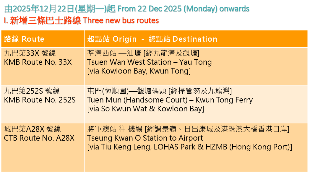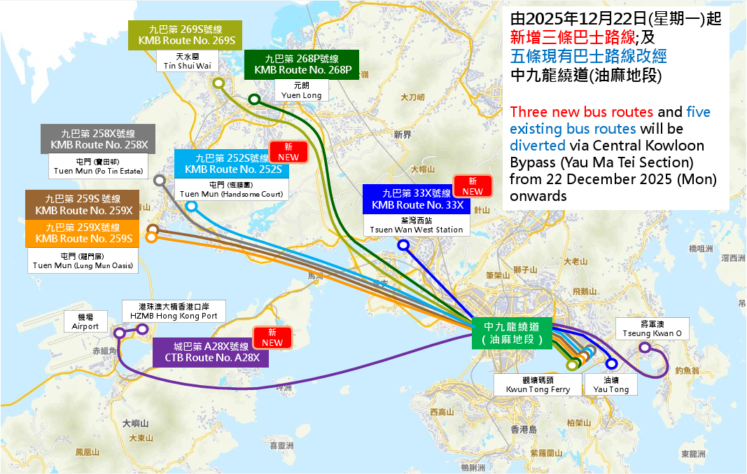 由通車後的首個工作天即12月22日(星期一)起,共有8條專營巴士路線途經繞道,包括新增3條路線途經繞道,以及調整現有5條路線改經繞道,全部均於星期一至五(公眾假期除外)繁忙時段提供服務。