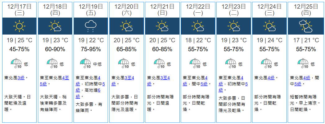 根據天文台最新九天天氣預報,周日(12月21日)冬至日部分時間有陽光,日間溫暖,氣溫介乎20度至25度;到下周三(12月24日)平安夜,部分時間有陽光,日間乾燥,氣溫介乎19度至24度;而到下周四(12月25日)聖誕節,最低氣溫跌至17度,最高氣溫21度,短暫時間有陽光,早上清涼,日間乾燥。
