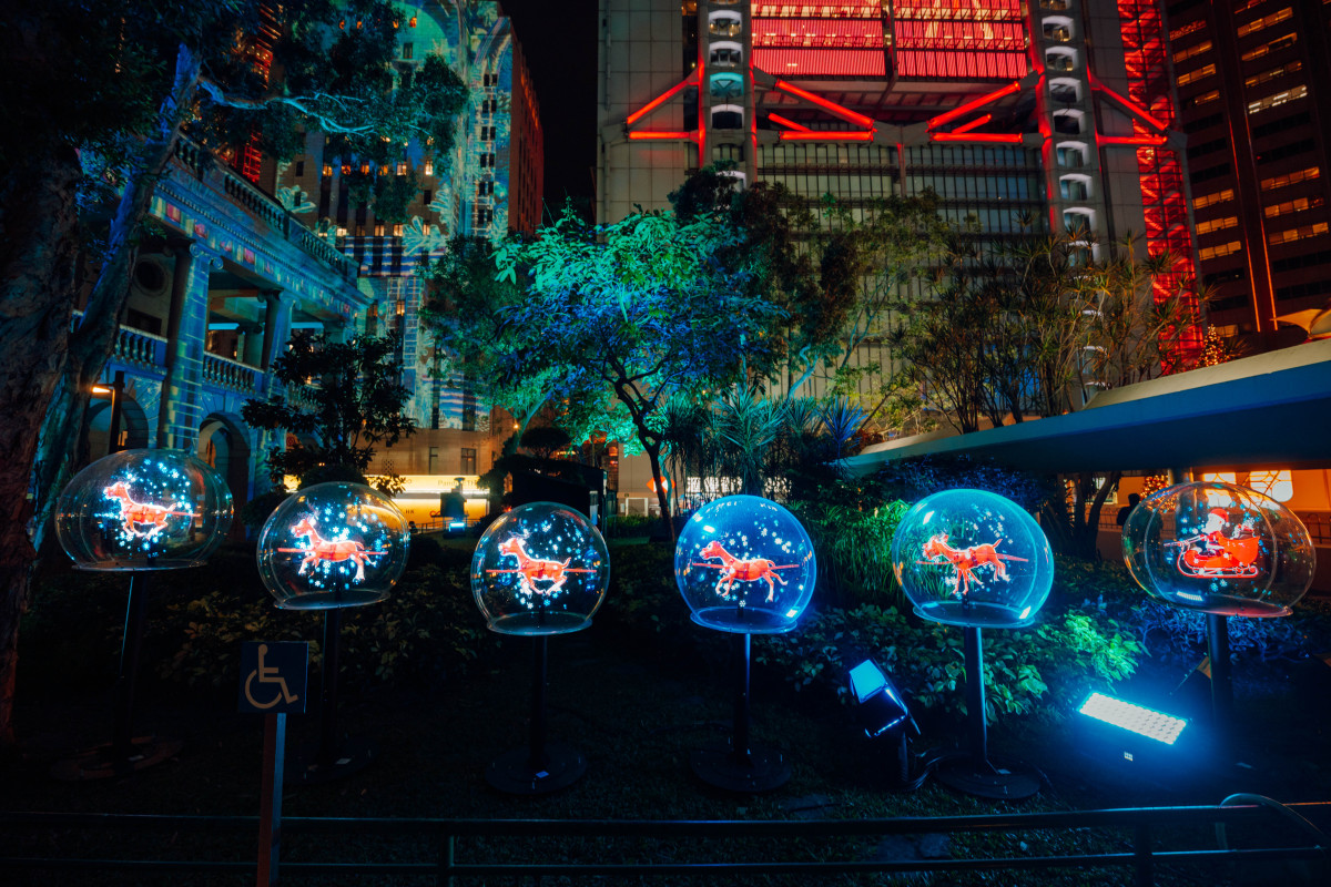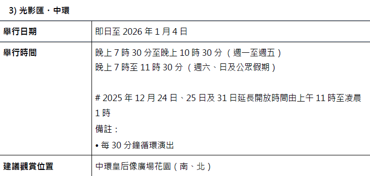 「光影匯・中環」結合多幢大廈外牆的十多幕4K高清投影、動畫、燈光特效,以及地面立體視覺裝置,甚至多棵大樹上時刻變動的光影,呈現多層次視覺效果。諸多冬日場景整晚環繞「聖誕天地」,栩栩如生的冬日聖誕影像同時呈現在場內約30個立體全息投影球,市民和旅客可近距離打卡,提升觀賞體驗。9首經典節日樂曲亦重新編曲,貫穿整個演出打造沉浸式視聽體驗。