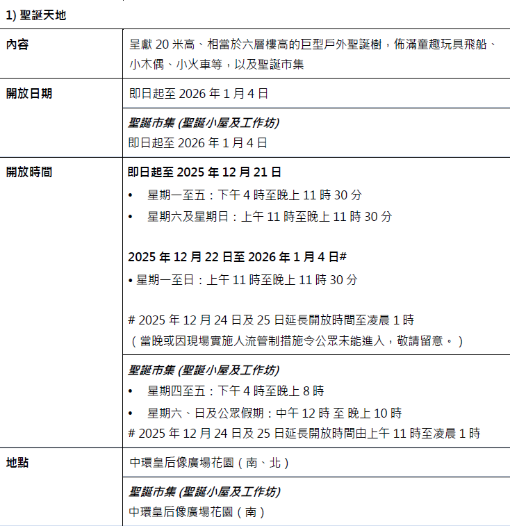 在八大地標建築的中心位置,中環皇后像廣場花園變身成「聖誕天地」——相當於六層樓高的20米巨型戶外聖誕樹隆重登場;整個「聖誕天地」滿溢童趣,放大版的經典玩具飛船、小木偶、小火車等,邀請各位合照打卡。臨近聖誕節,聖誕頌歌表演的悠揚樂韻響徹「聖誕天地」,屆時聖誕老人亦會驚喜現身,營造節日氣氛。