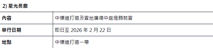 另外,遮打道「星光長廊」及中環皇后像廣場花園「聖誕天地」的20米高戶外聖誕樹現已登場;旅發局亦與業界聯手推出逾580項餐飲、購物、景點及交通禮遇。