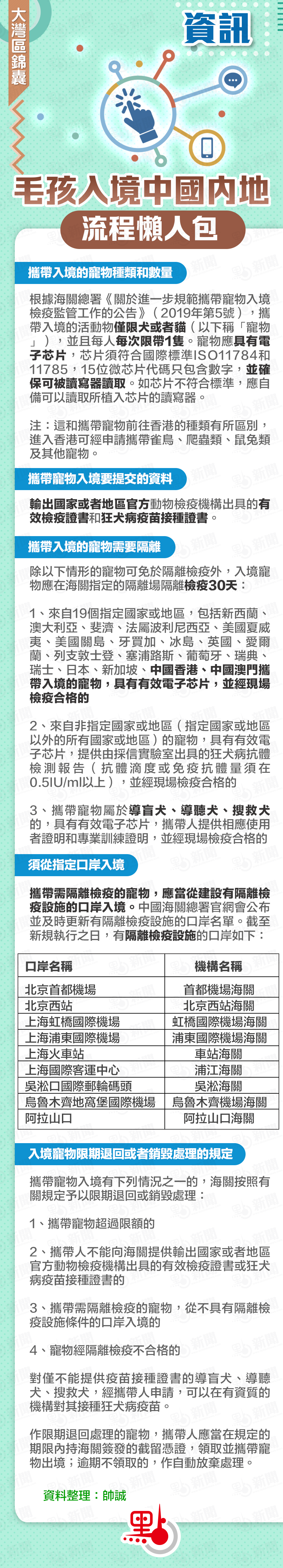 然而,寵物入境中國內地的手續究竟該怎麼辦?文件怎麼準備?流程會不會很複雜?本期點妹為你一步步拆解帶寵物入境內地的要求與流程,陪你提前準備,穩妥安排,讓你的毛孩順利「通關」!